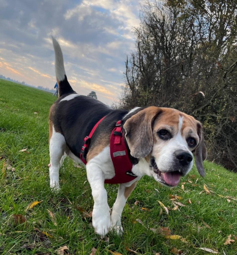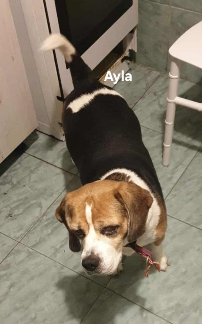 Ayla is een Beagle, ze heeft altijd bij een gezin met kinderen gewoond, in Roemenië. Omdat 1 van de kinderen erg ziek is en de ouders vaak in het ziekenhuis zijn zat Ayla constant alleen en hebben ze haar naar een opvang gebracht. Daar heeft ze maar 1 weekje gezeten, we hebben haar naar Nederland gehaald, zij verdient nog een paar mooie jaren. Ze is erg graag onder de mensen