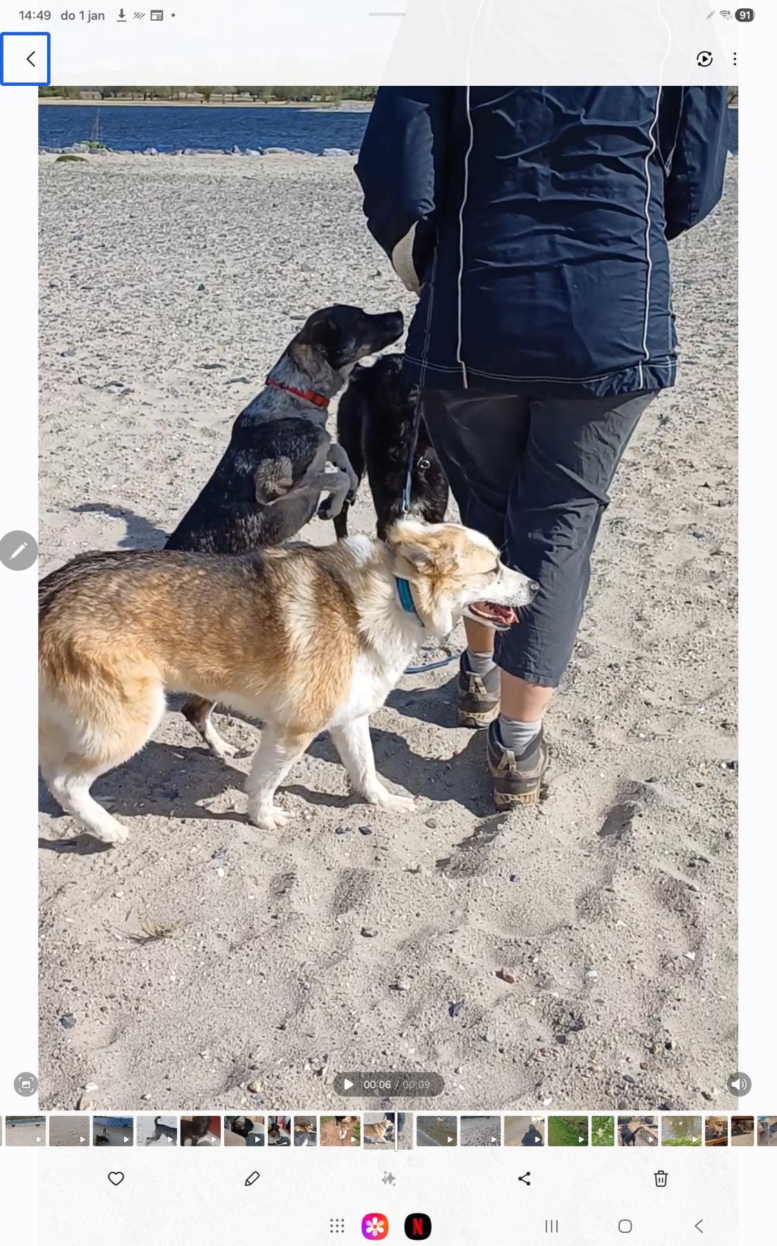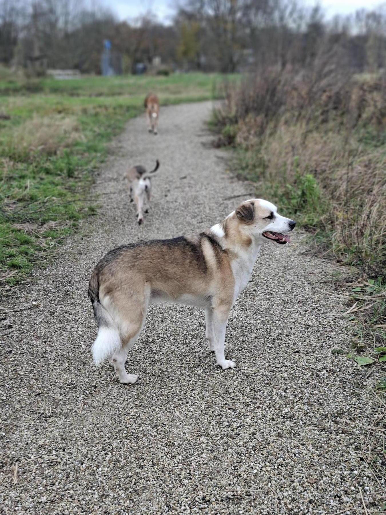 Hij loopt altijd los omdat hij bij de baas in de buurt blijft, hij is nog altijd voorzichtig, voor fietsers en onbekende honden, de voor hem bekende honden begroet hij enthousiast.