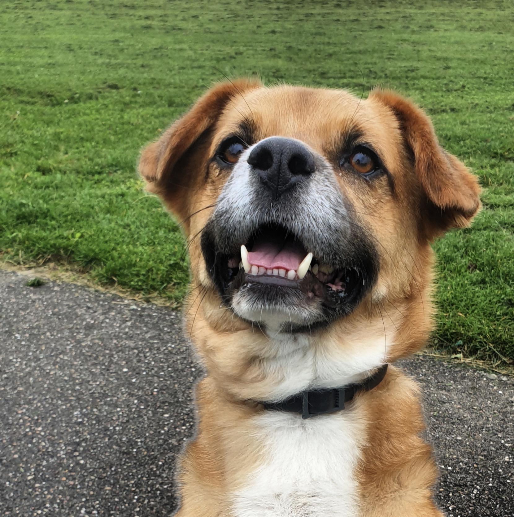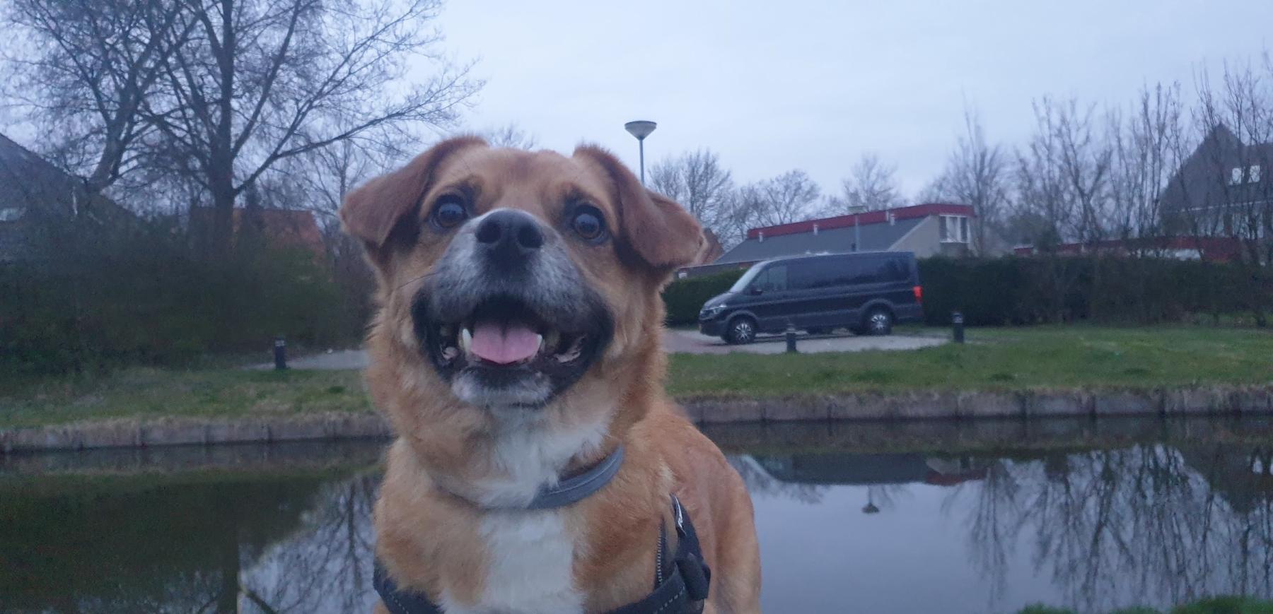Middelgrote hond (±13 kg) met een lang lijf en korte pootjes (corgi-achtig). Bruin/oranje vacht, wit befje en pootjes, en een lief grijzend snoetje.