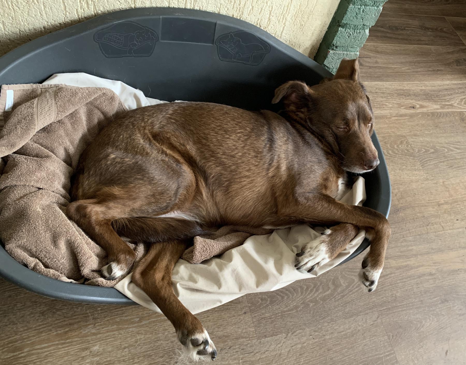 Komt uit Spanje van een asiel die gesloten werd en leeg moest op de dieren omdat de gemeente alles zou slopen voor nieuwbouw. En zij was 1 van de overgeschoten honden die nog niet geplaatst was. Brown verdient na alle verwaarlozing een fijn pensioen