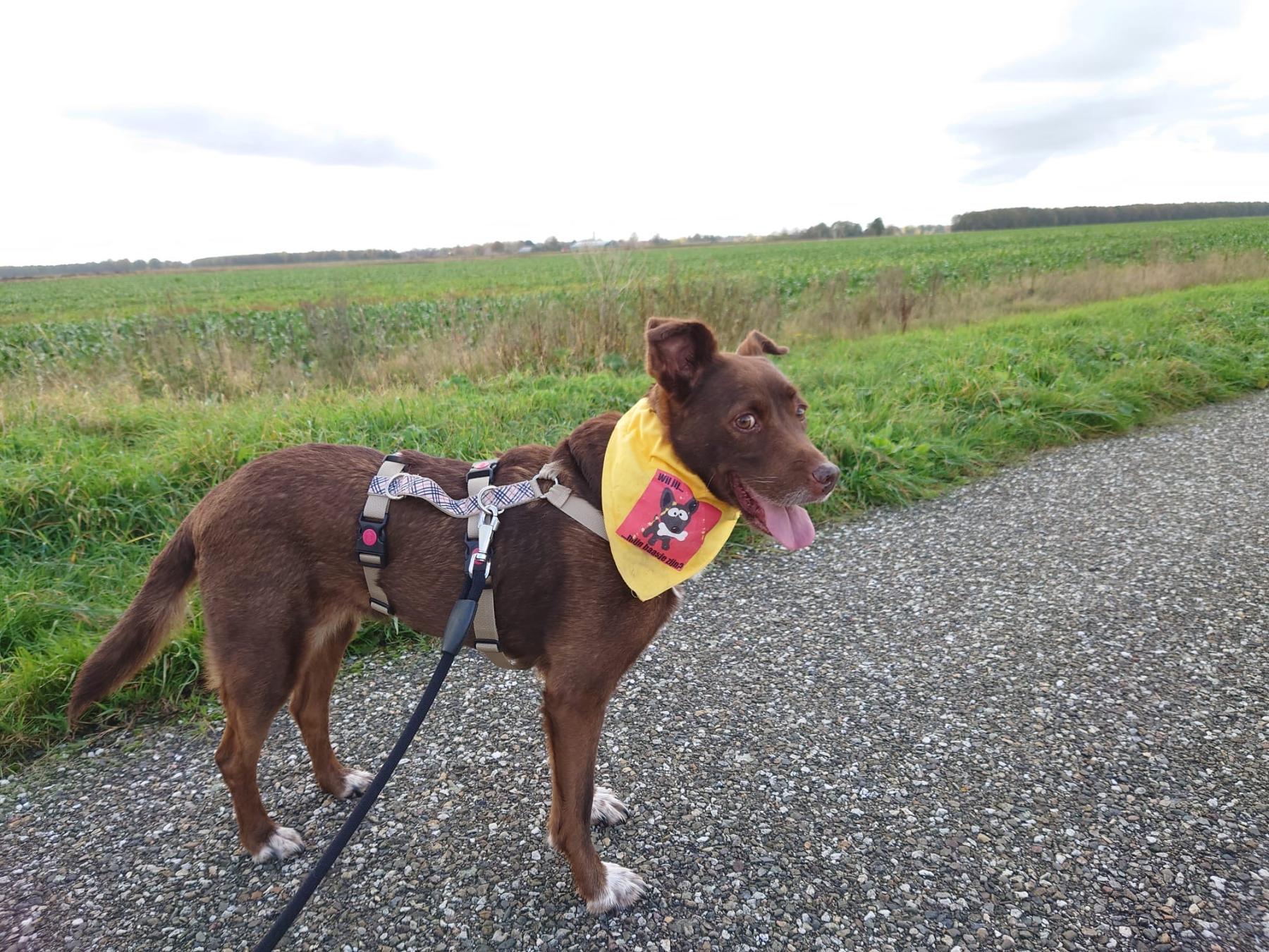 Brown is een onherleidbare mix met 47cm en 20 kilo een leuke middelmaat. Sommigen zien een labrador in de mix en anderen een Amerikaanse staffie. Ze heeft in ieder geval het bijbehorende enthousiasme en lompheid van deze rassen. Sociaal in de roedel en kan soms leuk met andere honden spelen, maar een huis als hond alleen lijkt het meest geschikt. Met wandelen reageert ze prima op vreemde honden.