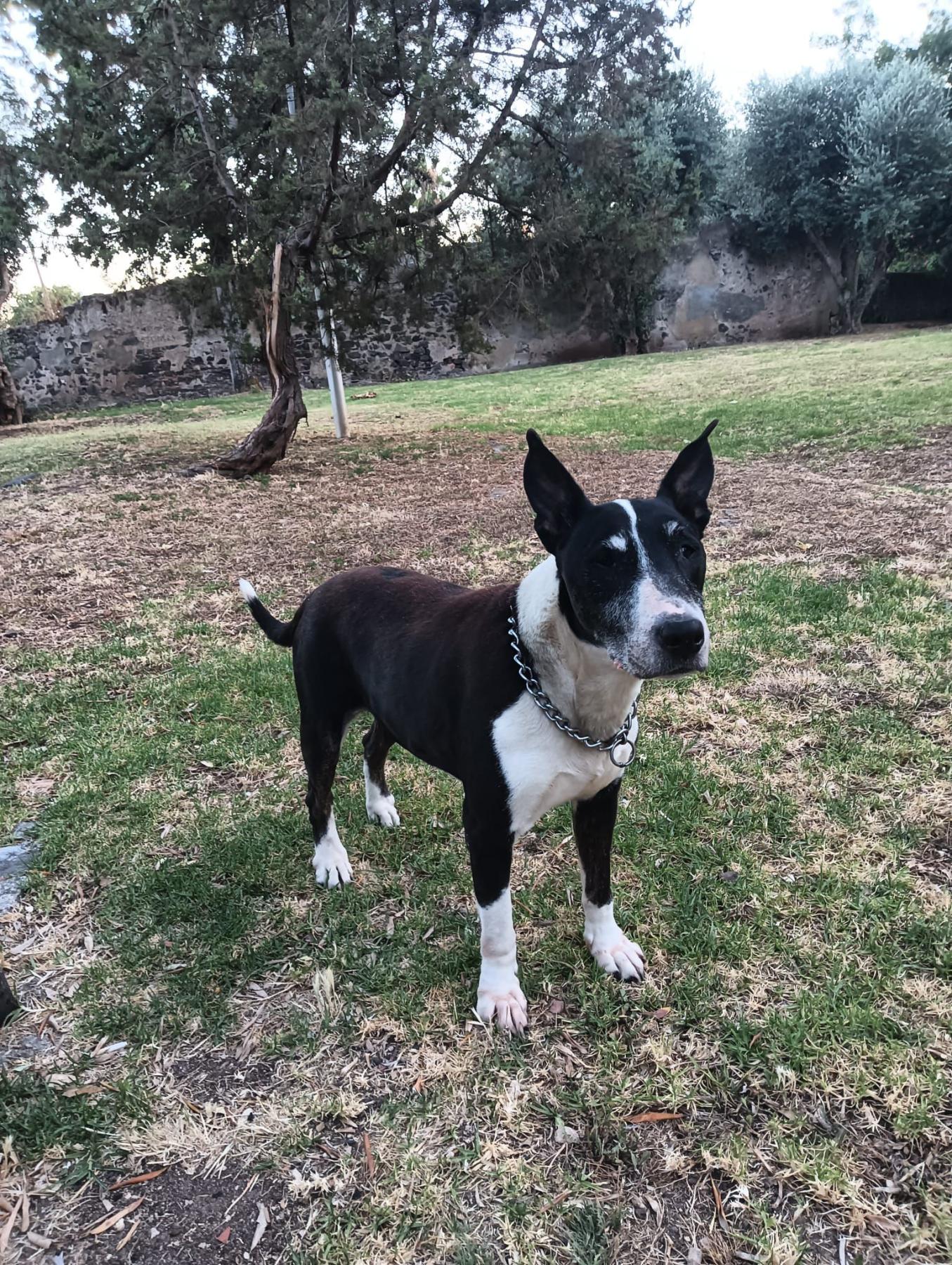 Deze prachtige kruising bull terriër is 11 jaar oud en zo lief als honing.