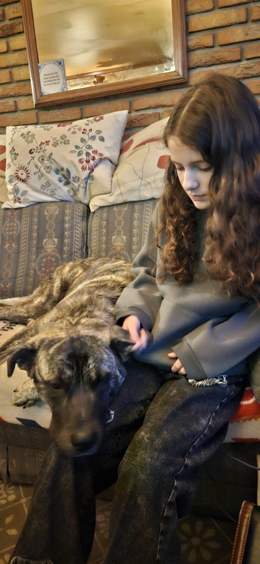 Hij wordt heel blij van lekker mee naar buiten en wandelen, spelen en rennen. Hij kan prima met kinderen, hoewel hij voor kleine kinderen misschien een beetje lomp is (maar wel lief).