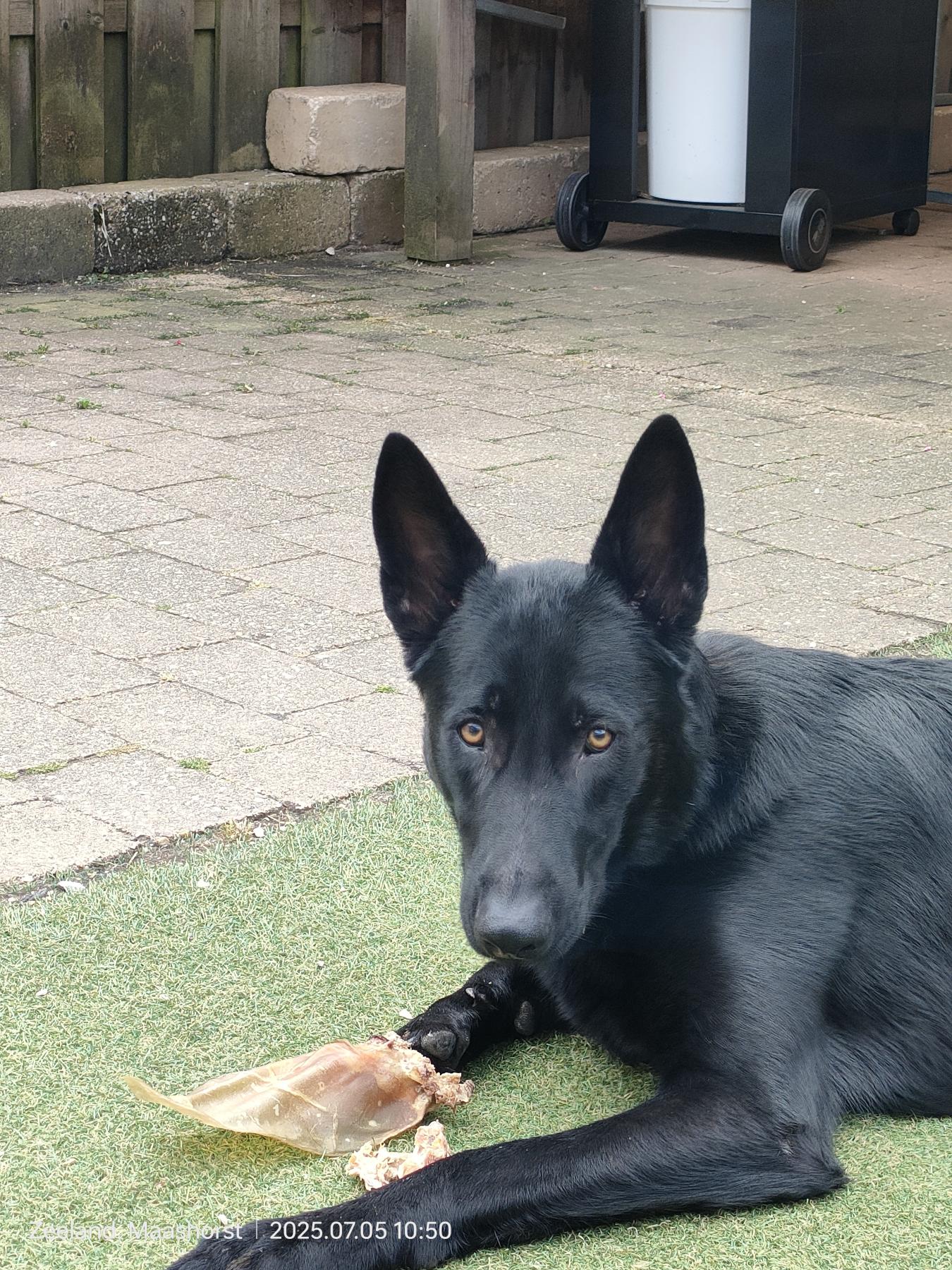 Dio is een lieve speelse enthousiaste Duitse Herder die in een rustige omgeving zijn plek goed zal vinden. Dio heeft cursus gehad en luistert goed naar de bekende commando's. Hij werkt graag voor zijn baas. Dio heeft veel energie en heeft dus veel uitdaging nodig. Denk aan speurwerk en wandelen.