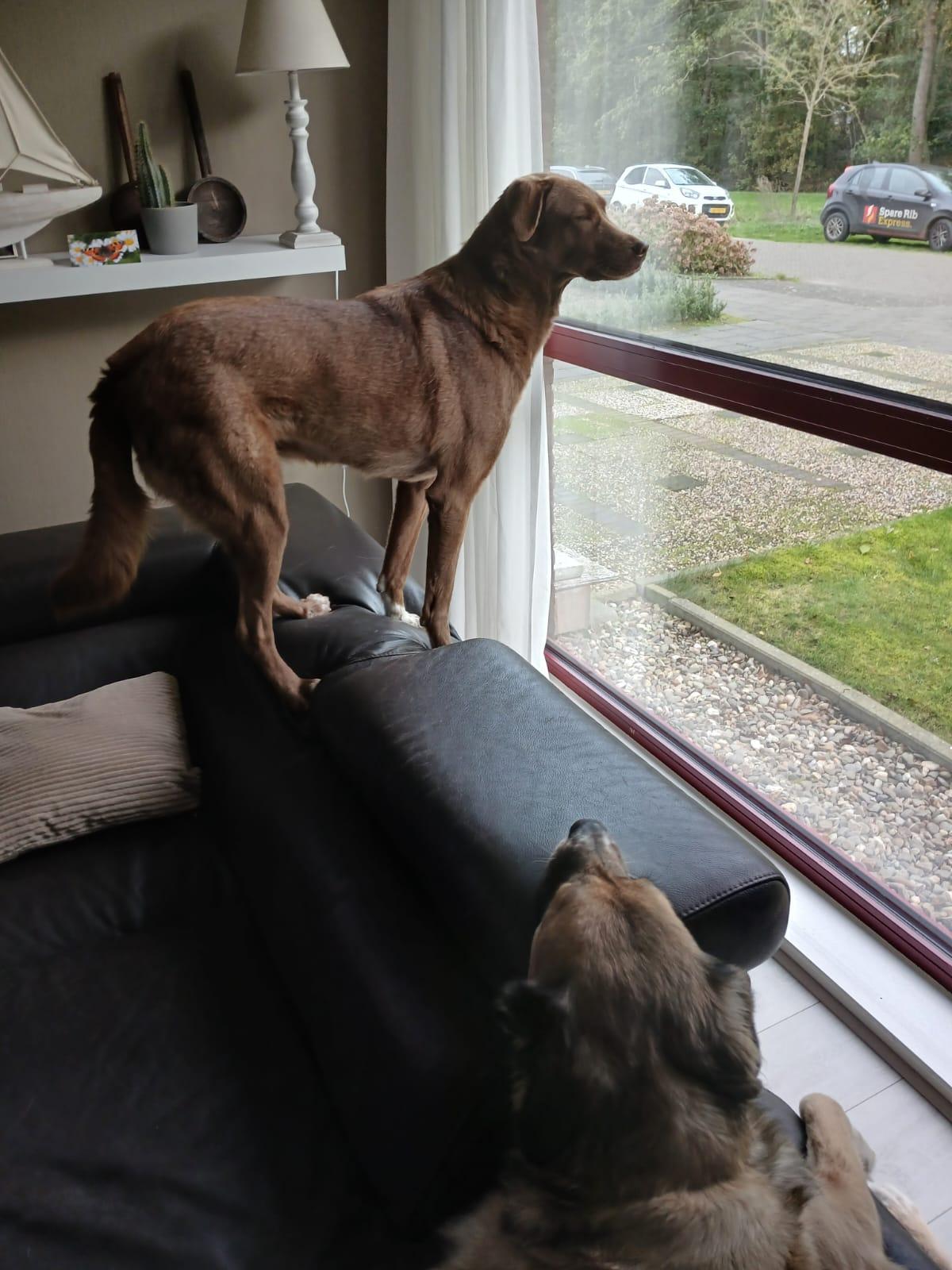Zij kan al een paar uurtjes alleen zijn, maar heeft dan wel gezelschap van haar hondenvriendjes.