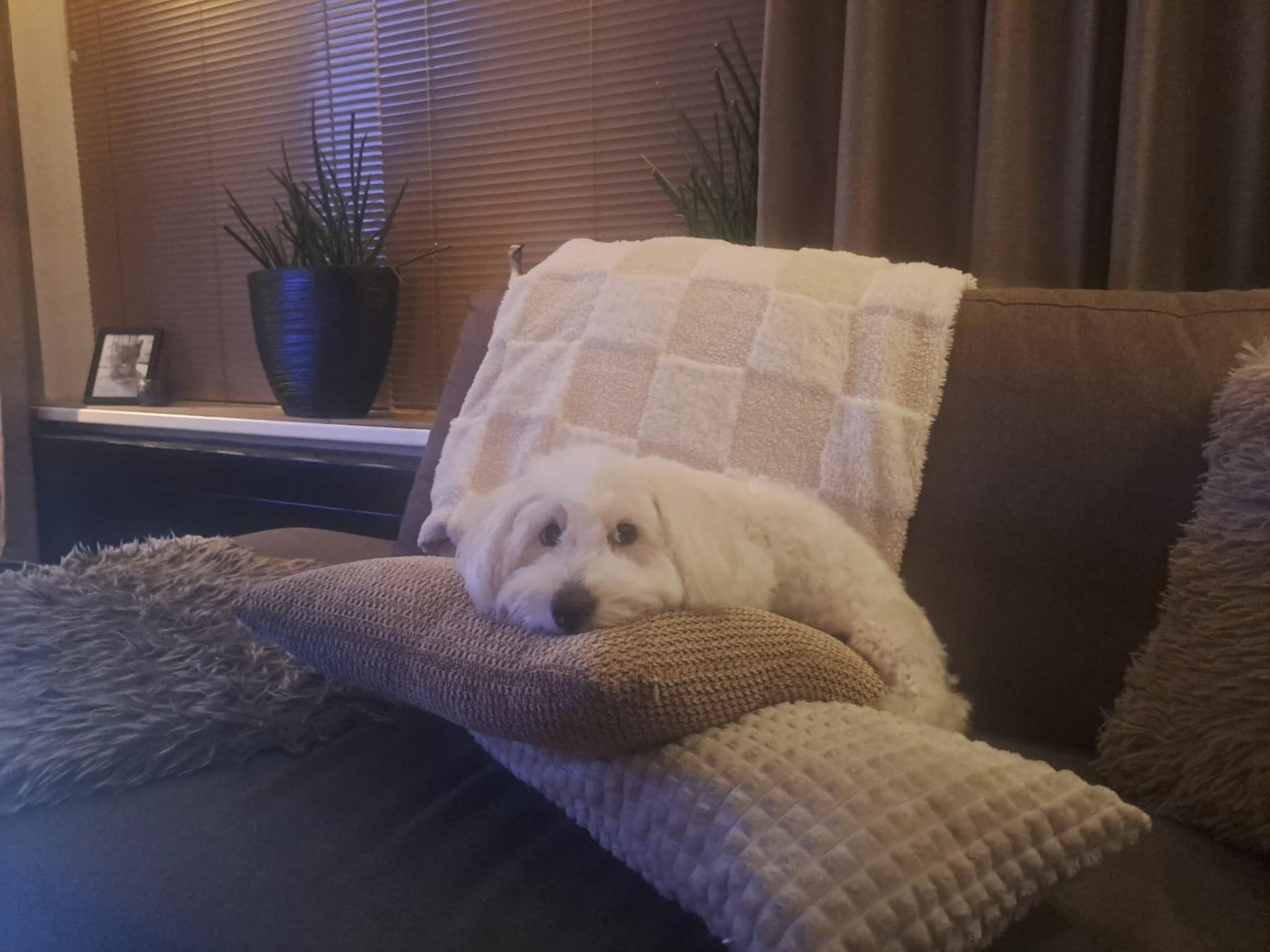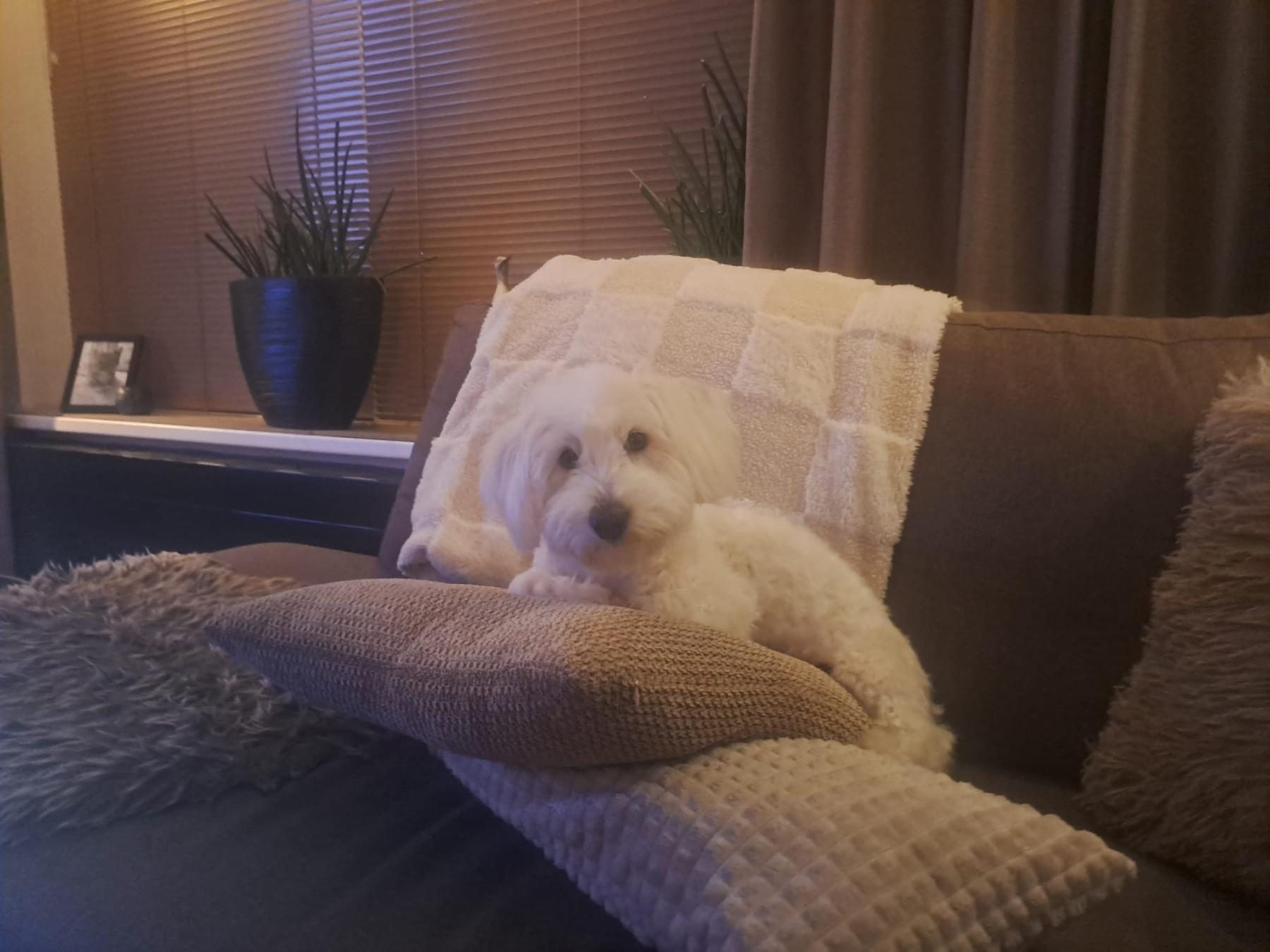 Lieve rashond, een Coton de Tulear, ze is graag bij het baasje in de buurt, ze volgt je vaak. Ze wil niet graag lang alleen zijn. Ze houdt van buiten zijn, snuffelen en wandelen. Ze kan goed grote afstanden lopen. Ze kan in het bos loslopen, want blijft goed bij je in de buurt. Ze houdt niet van katten en honden. Ze moet helaas herplaatst worden, omdat ze veel ruzie heeft met moederhond.