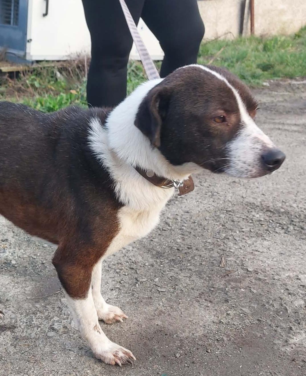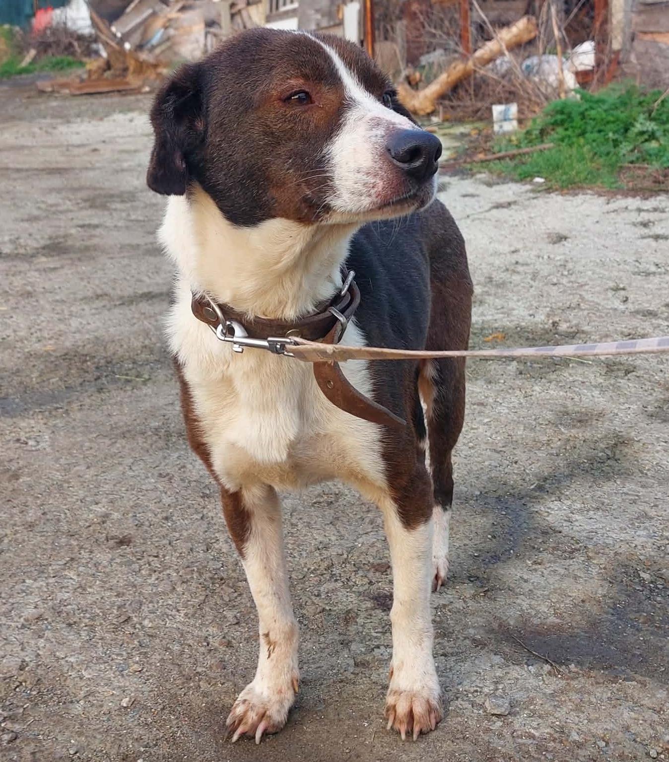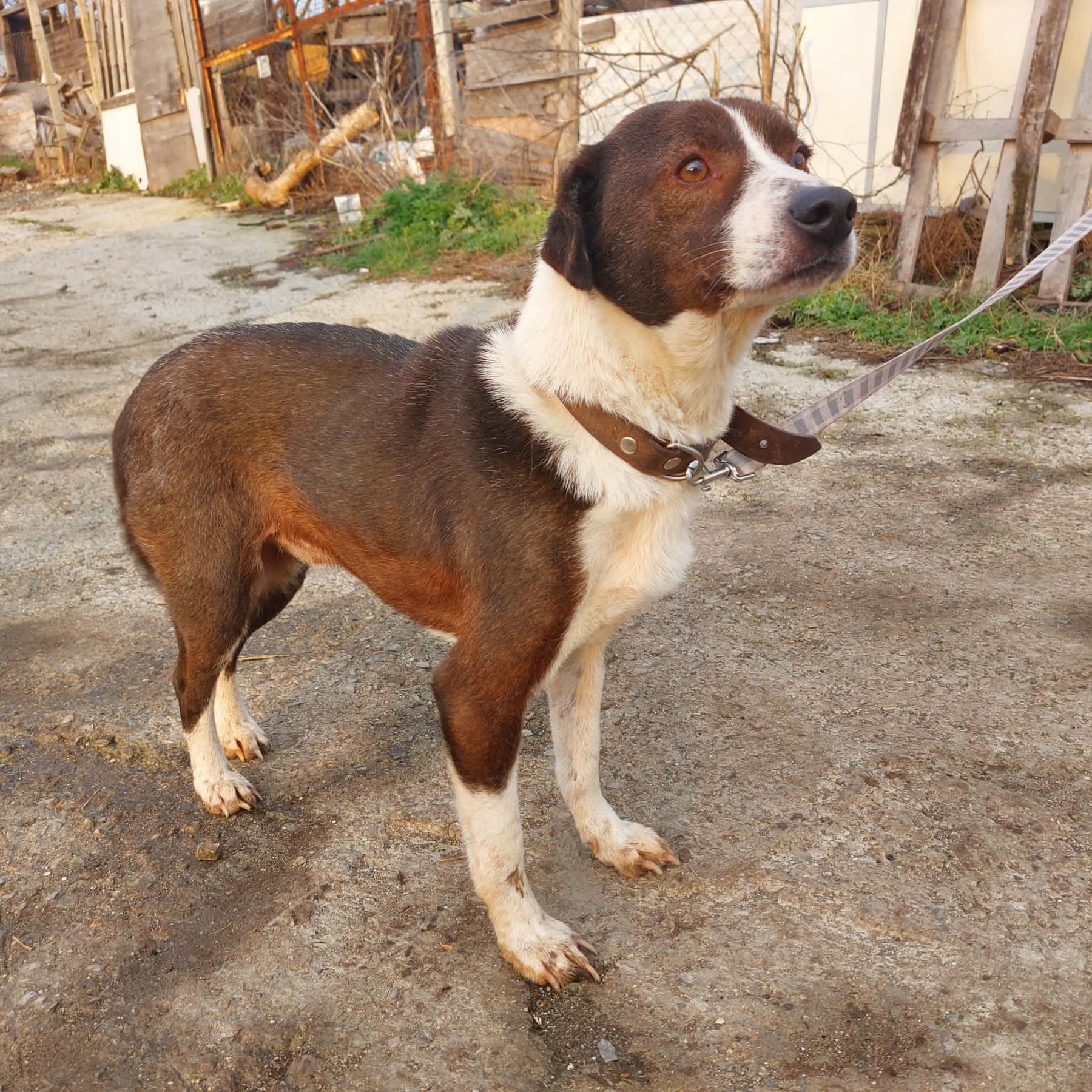 Hij werd op de weg gevonden, aangereden door een auto. De mensen die hem vonden, brachten hem naar het asiel. Hij is geopereerd – een heupresectie. Het gaat nu goed met hem. De operatie werd uitgevoerd door professoren van de universitaire veterinaire kliniek.
