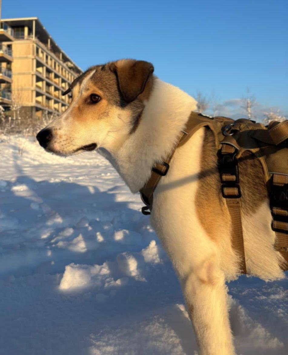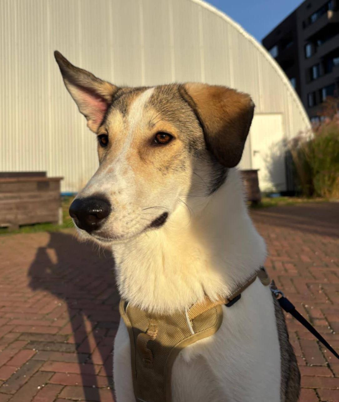 Ze kan ongeveer 4 uur alleen zijn, loopt netjes aan de lijn en trekt niet. Los spelen met andere honden gaat goed, maar haar terugroepcommando moet nog verder worden opgebouwd. Soms kan ze een beetje eigenwijs zijn. Ze gaat mee in de auto en springt zelf in de achterbak, al vindt ze het soms nog spannend.