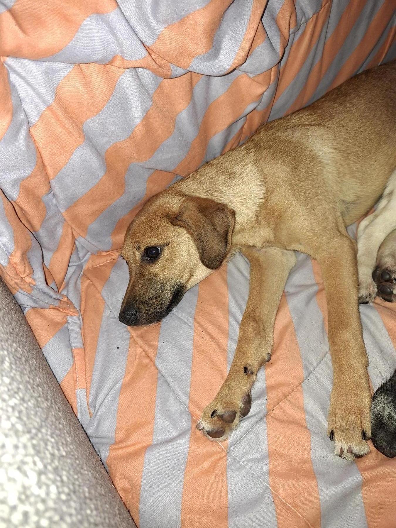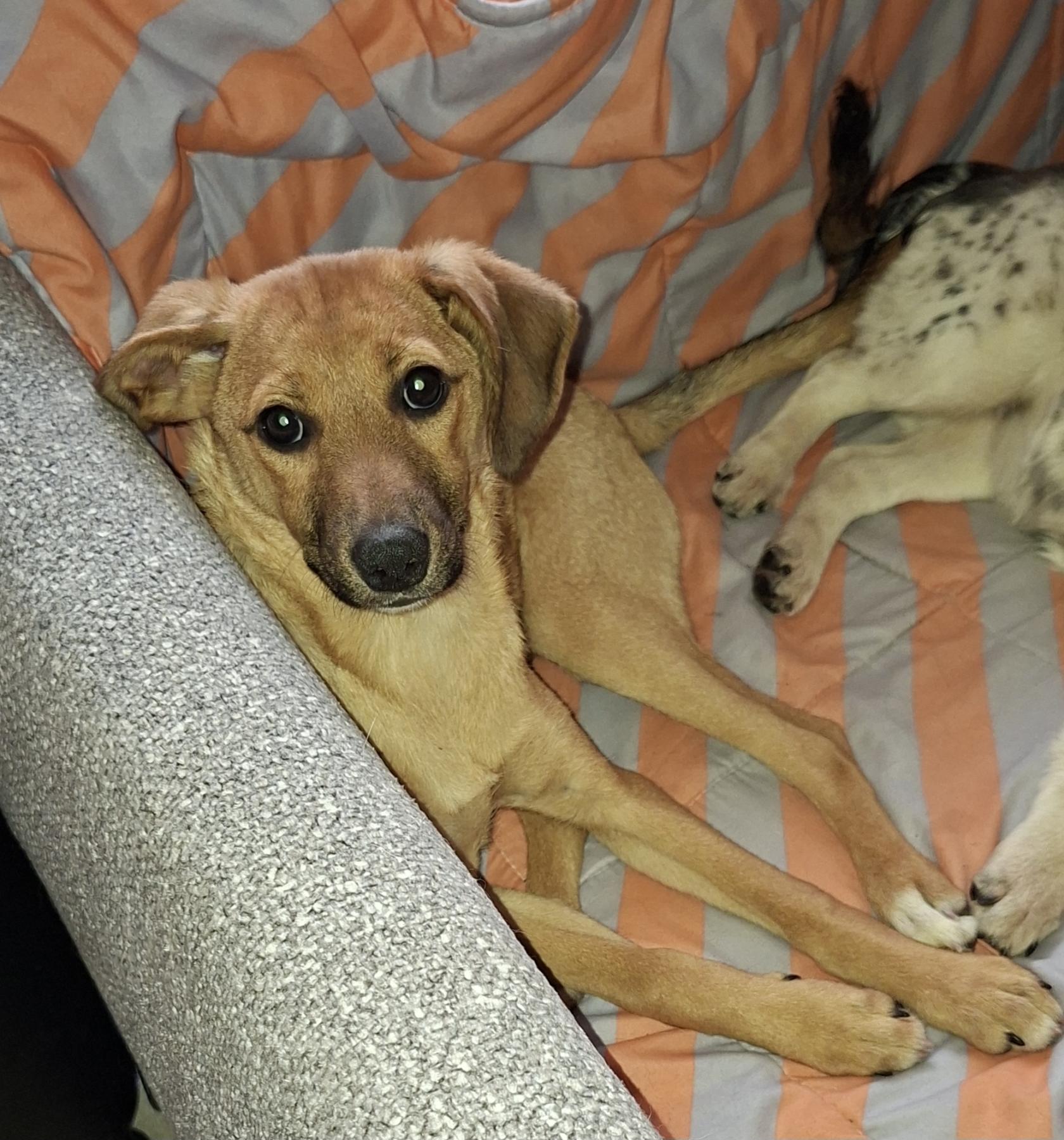 Op één foto staat ze, helemaal links, tussen andere pups, daar is goed te zien hoe slank ze is. Een paar van de andere pups wonen ook in nederland en zijn voor adoptie.