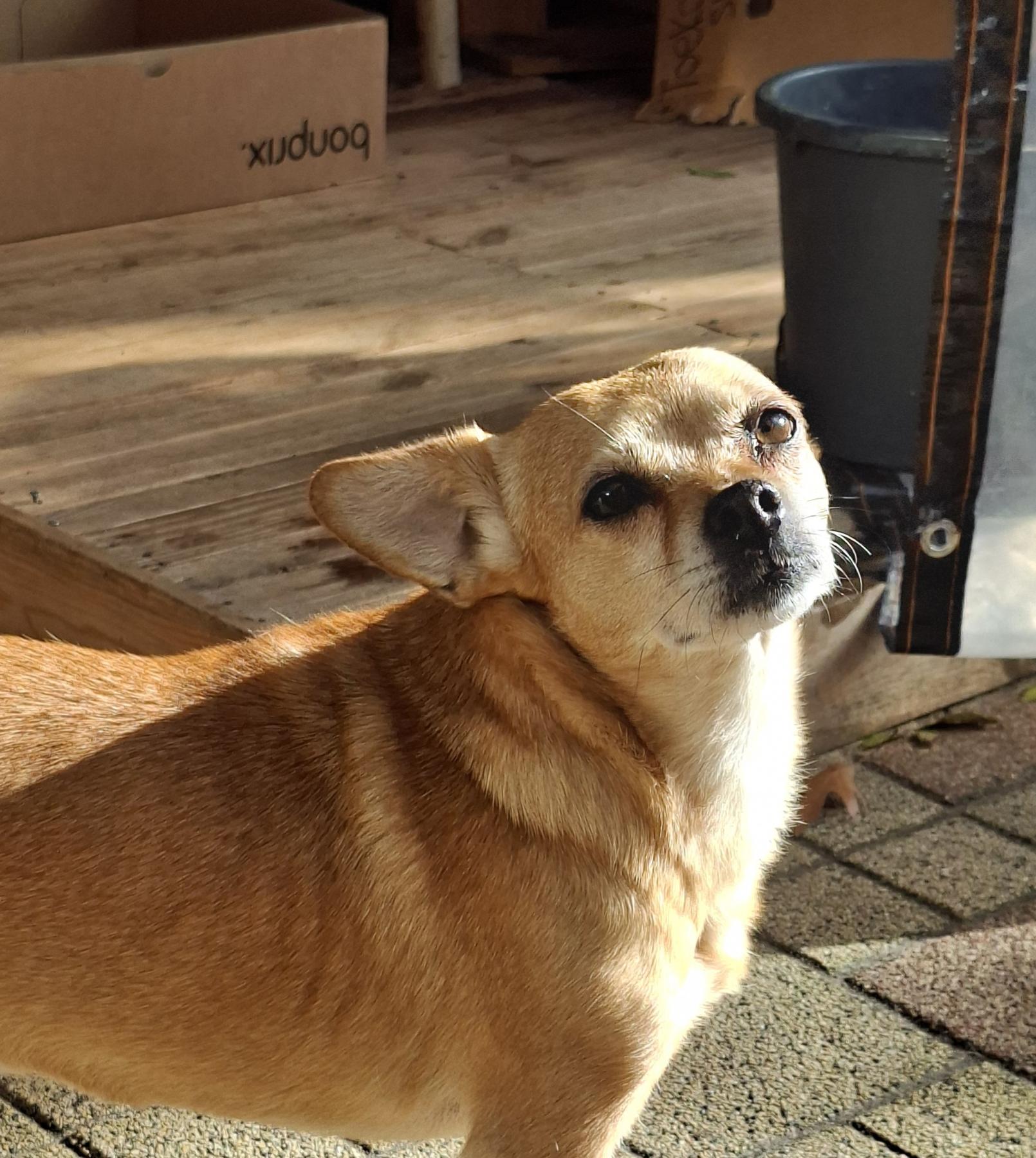 Ze lijkt een kruising chihauhua met een buldog, gezien haar gespierde lichaam en energie, weegt 8 kilo en 30 cm hoog, geen luie mensen hondje, ze wil wandelen, rennen, praten met andere honden, kortom een Levenslustig typje