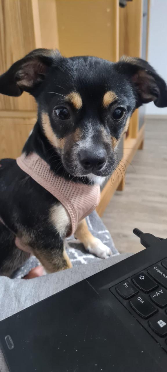 Haar vooruitgang is bewonderenswaardig: van huilend in een hoekje zitten… naar een vrolijke, dappere pup die van het leven houdt. Ze heeft nog een klein beetje opwindeningsplasje, maar ze leert snel en gebruikt haar toiletmatje al heel goed.