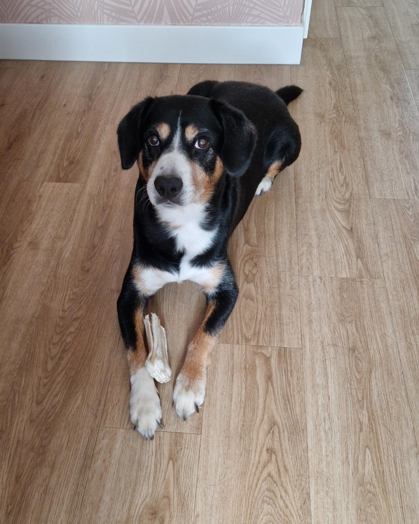 Lieve aanhankelijke hond. Geen allemans vriend is naar vreemden allert. Waaks maar blijft niet eindeloos blaffen. Tijdens het uitlaten wat onzeker, gaat regelmatig liggen als hij andere honden ziet en wil ook wel eens blaffen. Wij wandelen 4x per dag een kwartier soms iets langer, is het meest op zijn gemak als de omgeving bekend is en een beetje rustig