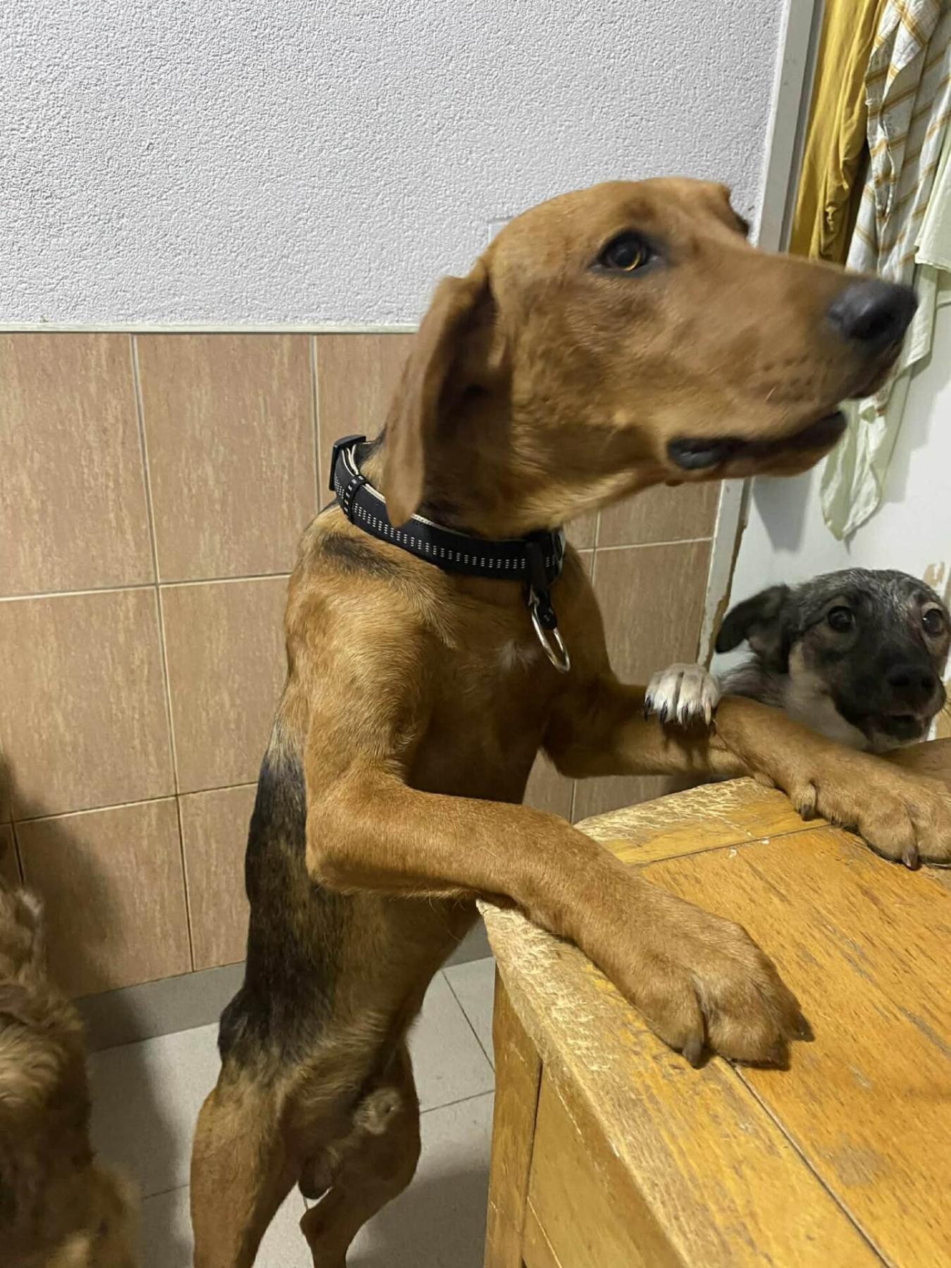 Katten zijn nog niet getest, maar Memo is van het type Posavski Hound — een ras dat doorgaans vriendelijk en sociaal is, ook tegenover katten.