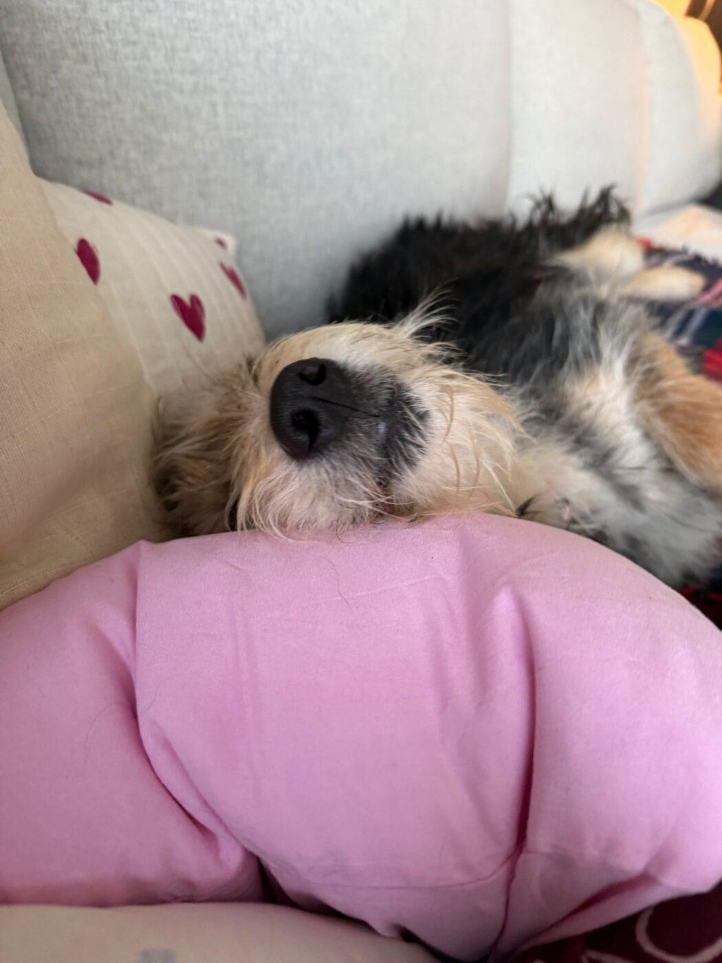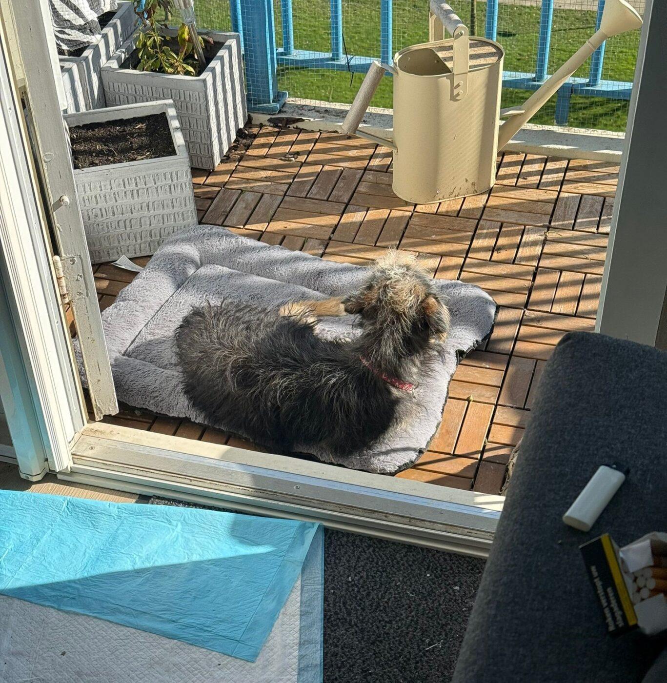 En dat doet hij. Hij ligt heerlijk in het zonnetje, speelt met een hondenvriendje die op bezoek kwam om zich daarna languit op de bank lekker te laten kroelen op zijn buikje. Mica geniet… met volle teugen. Zijn foster noemt hem; “Mica de levensgenieter”.