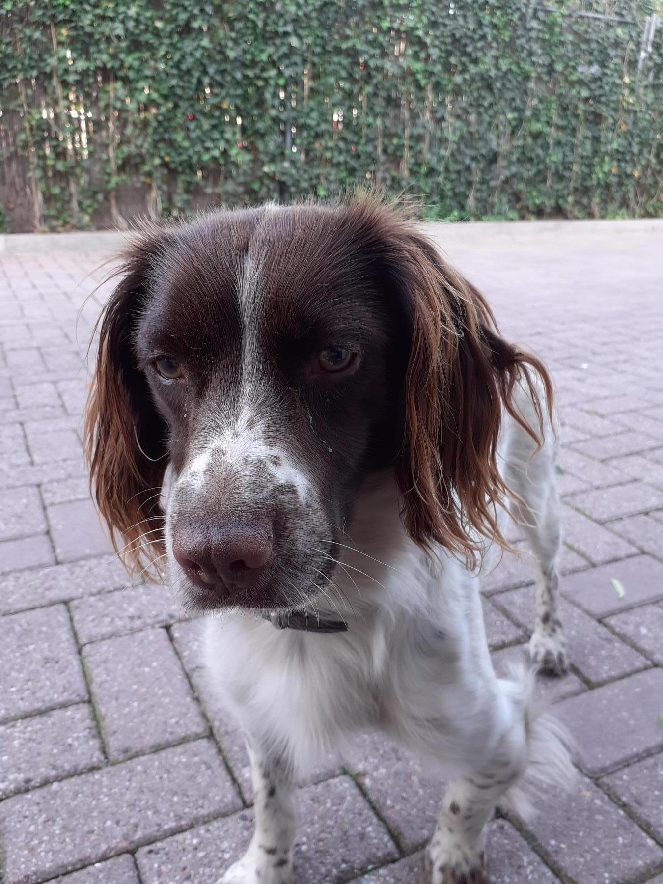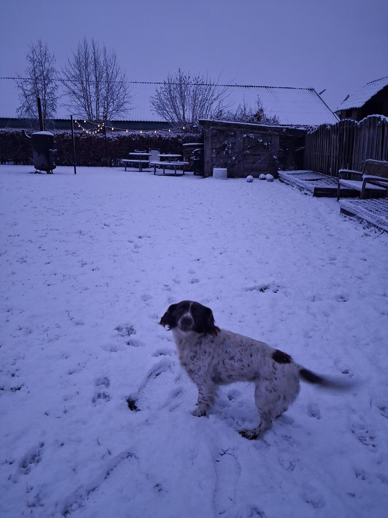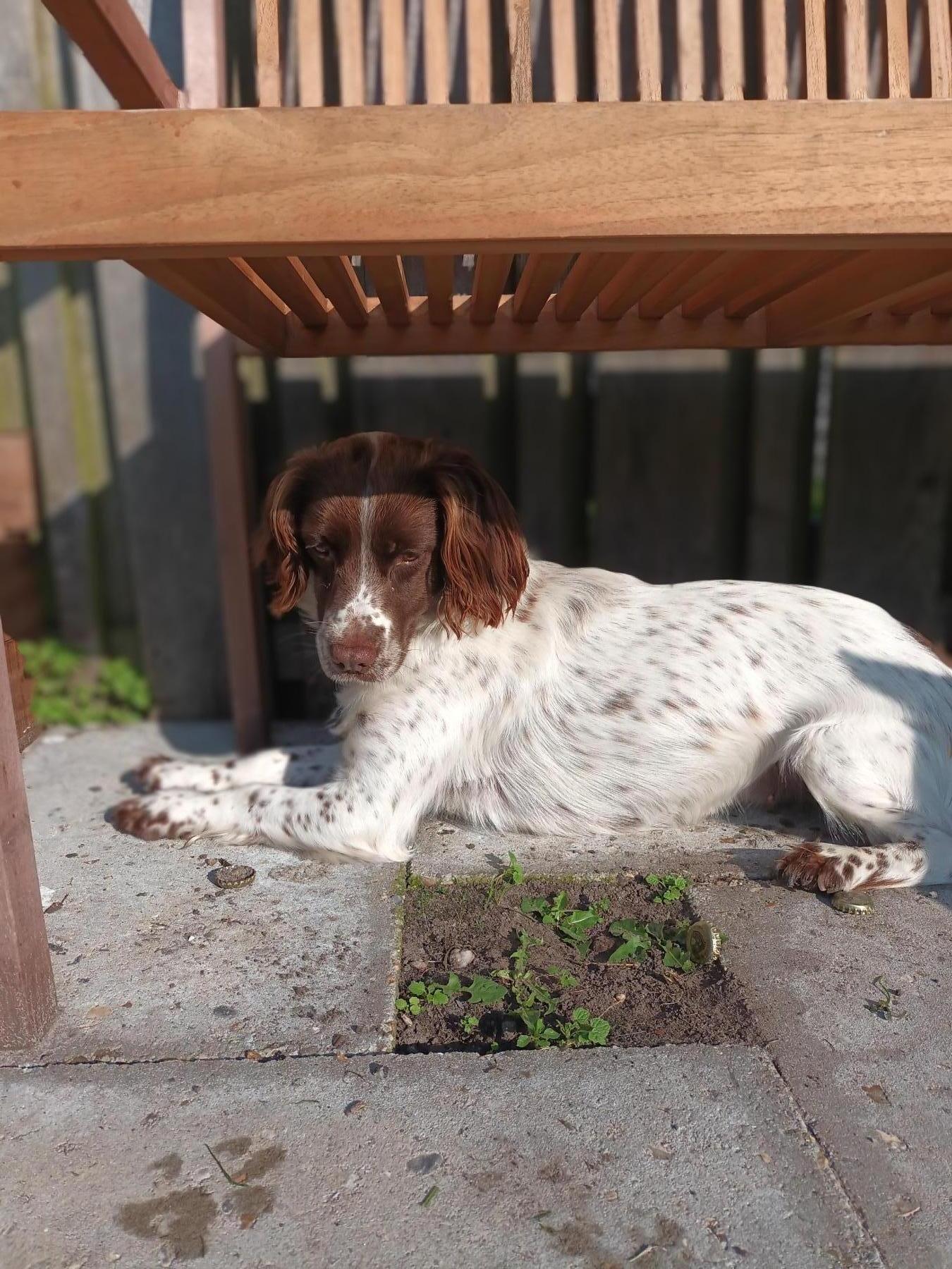 Ze is van kleins af aan buiten. Haar hok is in de tuin. Snachts zit ze vast en soms als er bezoek is die bang zijn voor honden. Ze jaagd op schaduwen en lichtflitsen, dat is niet geschikt voor binnen. Ze trekt aan de riem dus ik laat haar alleen los in het weiland uit. Soms glipt ze in de schuur en heeft er ook wel eens haar behoefte gedaan.