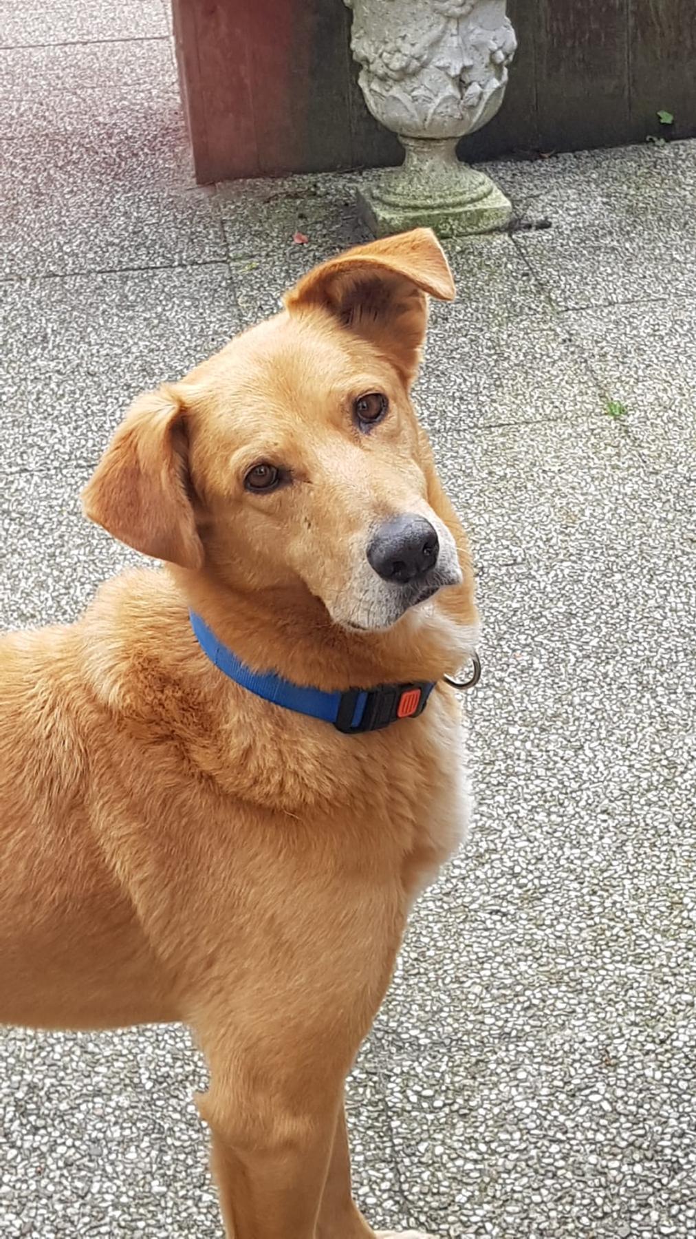 Met zijn 62 cm en 26 kg is hij groot, maar slank gebouwd. Zijn leeftijd is geschat op 6 jaar. Zeker weet je het nooit, maar onze dierenarts denkt dat het kan kloppen. Hij is in elk geval niet piepjong en zeker geen senior. Binnenkort wordt er een beschadigde kies getrokken, maar verder is hij door de dierenarts helemaal gezond verklaard.
