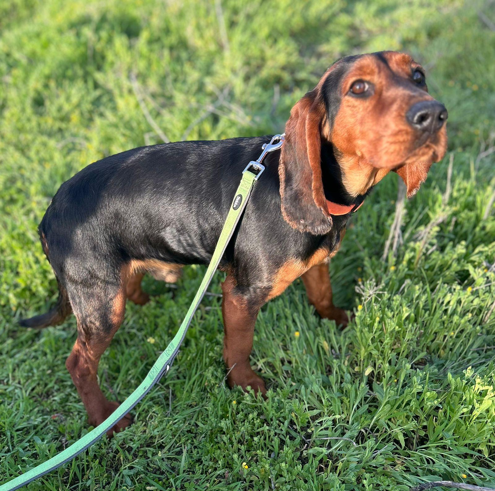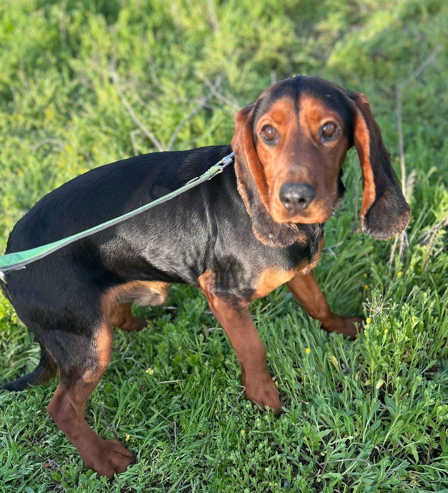 Porthos is een prachtige jachthondkruising met lange, hound-achtige oren en een glanzende vacht in een diepe, warme bruine kleur.