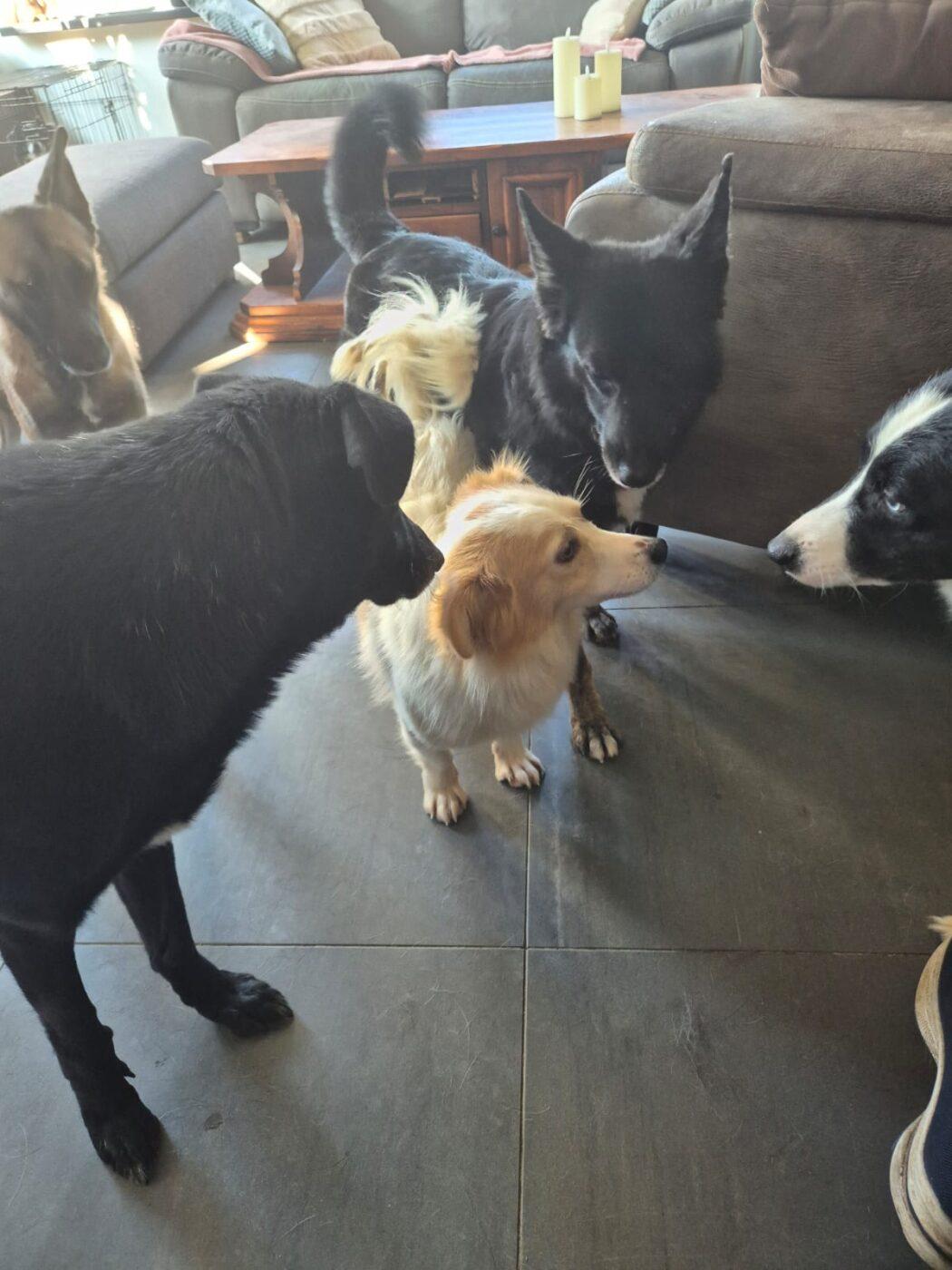 Met andere honden gaat hij heel goed om. Hij vindt iedereen eigenlijk prima en kan met alle honden goed overweg. Sociaal, ontspannen en in balans.
