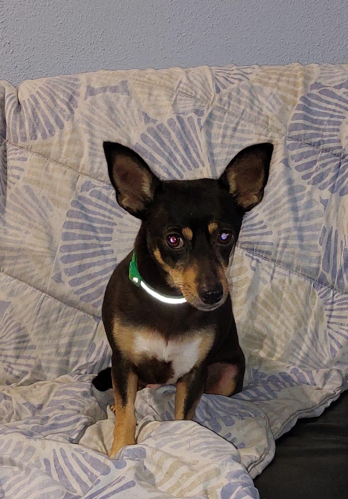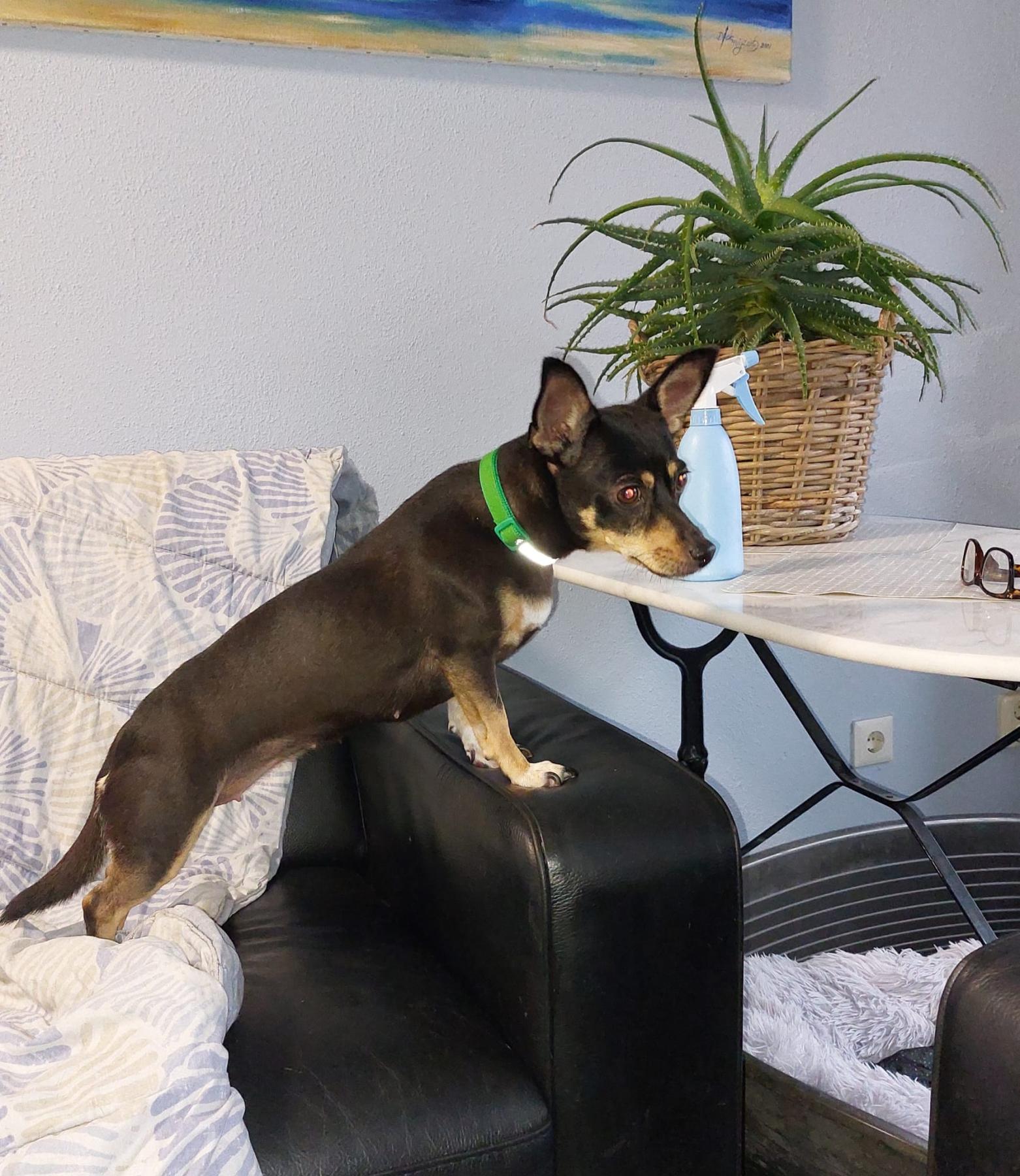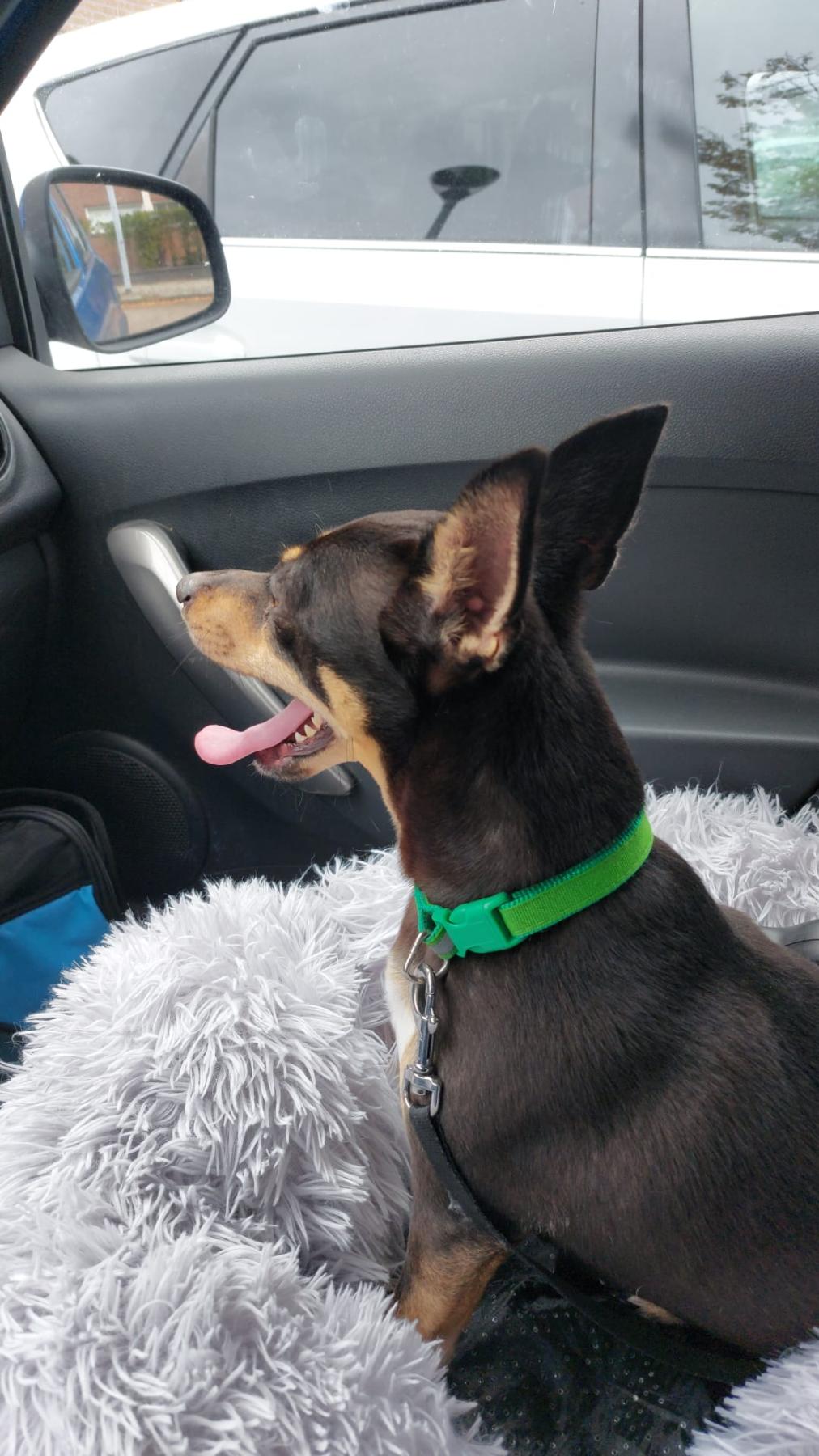 Ze weegt zo’n 5 à 6 kilo, is dus een handig formaatje voor op de bank of een gezellige wandeling.