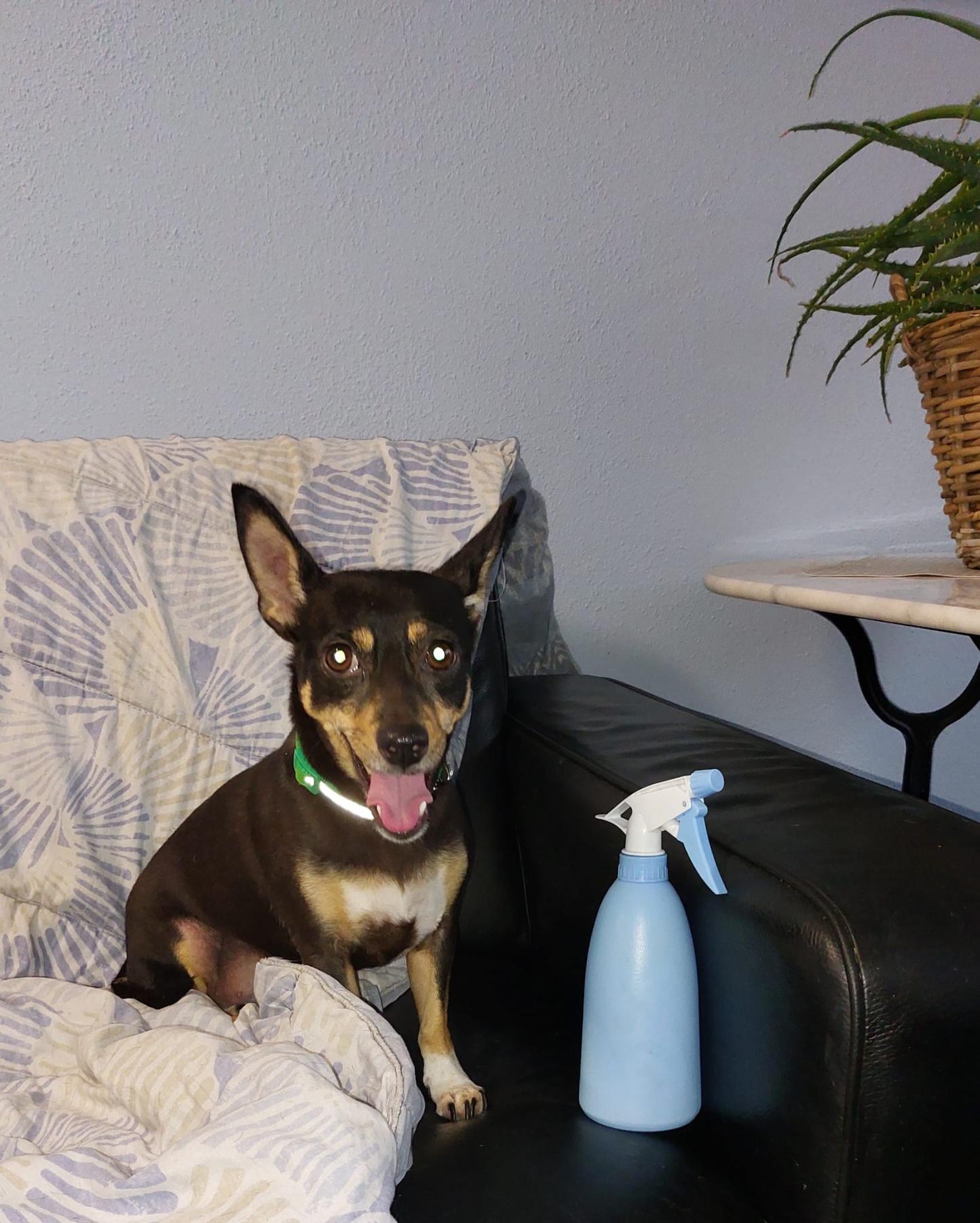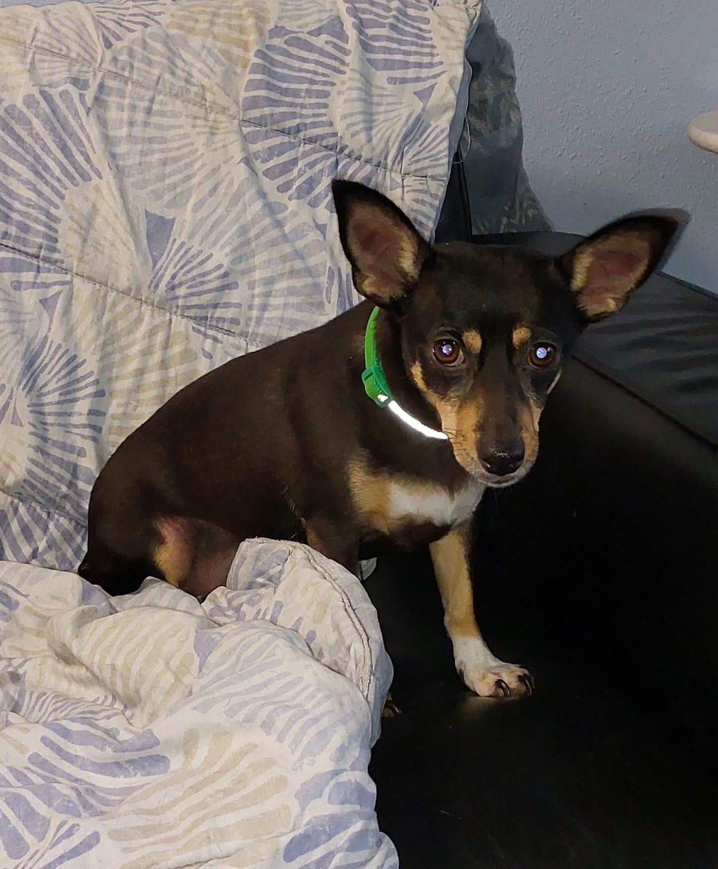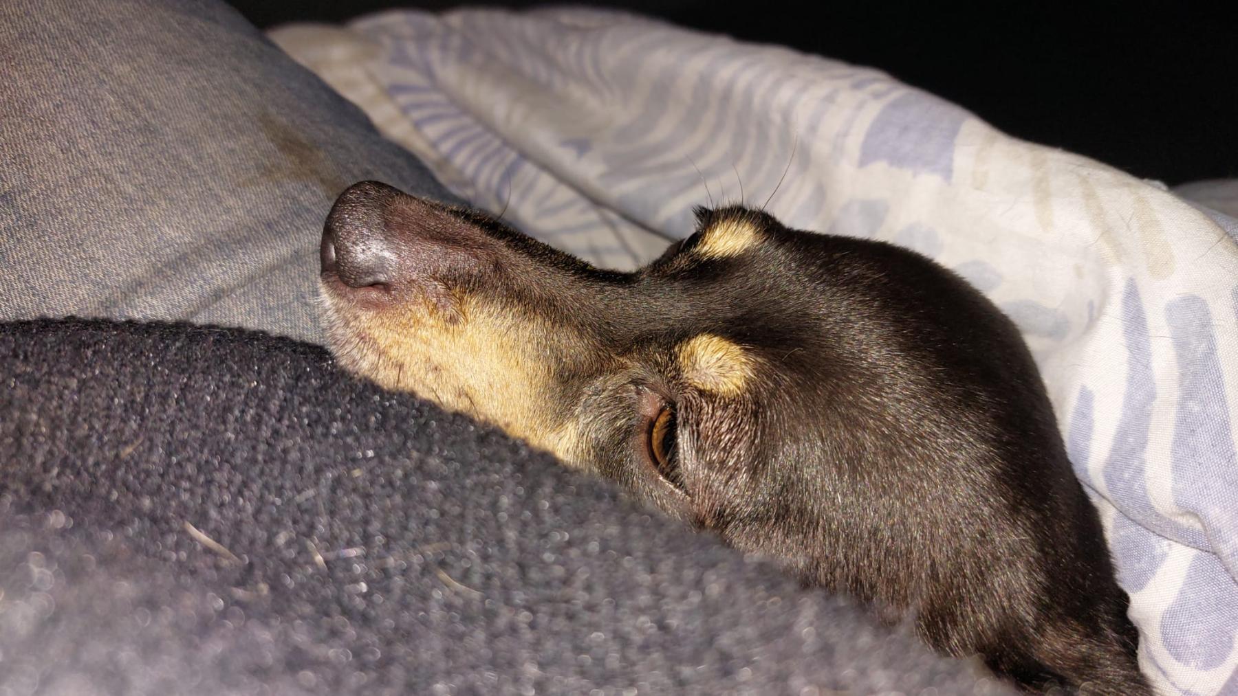 Ze weegt zo’n 5 à 6 kilo, is dus een handig formaatje voor op de bank of een gezellige wandeling.