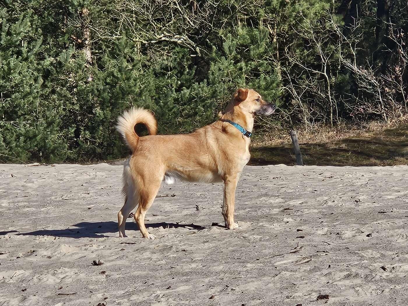 Buiten luistert hij goed, kan commando’s, is goed met alle andere honden, sociaal, speels en gewoon een heel blij ei. Ook als je andere honden tegenkomt is hij gemakkelijk terug te roepen.