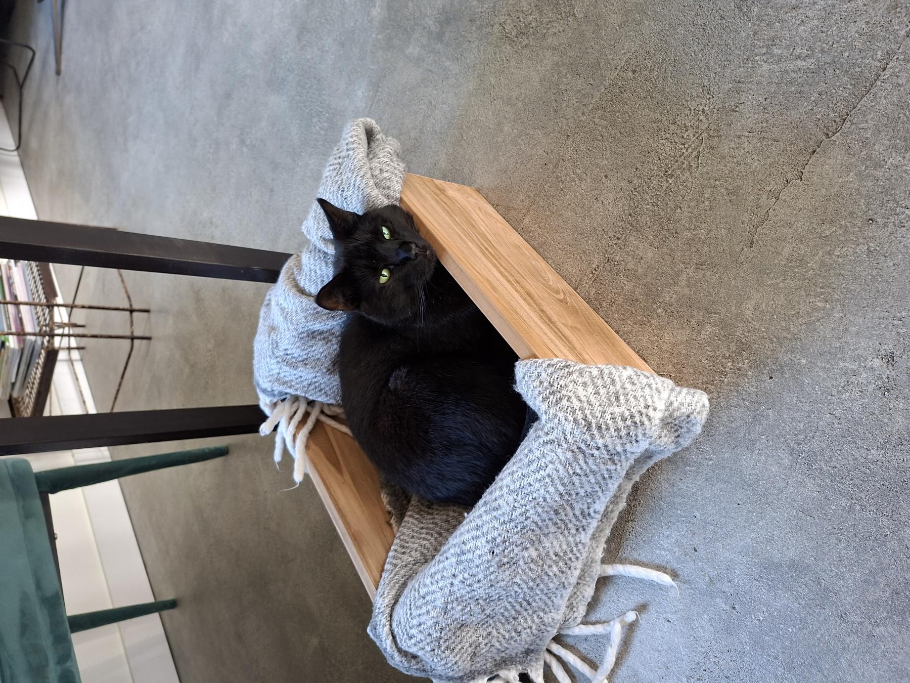Rustig, lief en vriendelijk. Hij houdt nog van een beetje spelen of op een muis jagen. Slaapt graag in een doos of vierkante bak. Komt nieuwsgierig kijken naar wat je aan het doen bent in het huis of buiten in de tuin.