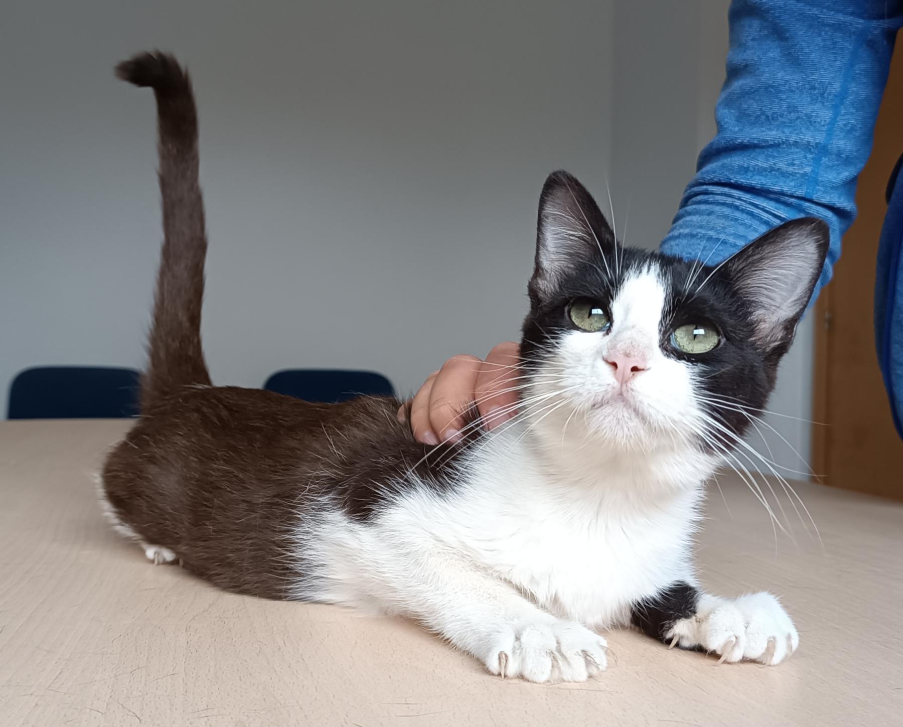 Evarista werd samen met haar broer Ezequiel gevonden toen ze nog baby's waren. Ze werden alleen gevonden in een boomgaard, zonder hun moeder. Ze moesten nog flesvoeding krijgen, maar ze wisten te overleven, dankzij de goede zorgen van de kattenverzorgster in het asiel. Evarista is een kitten met ataxie, ze heeft een beetje coördinatieverlies bij het lopen, maar ze kan rennen en springen. Ze is heel lief, super afhankelijk van mensen, sociaal en aanhankelijk. Ze zoekt altijd naar haar mensen om liefkozingen te ontvangen en achtervolgt je om je aandacht te trekken. Ze is schattig. Evarista kan goed overweg met andere katten, ze is onderdanig en vriendelijk. Maar ze houdt niet van katten die hard spelen omdat ze zich door haar ataxie niet goed kan verdedigen.