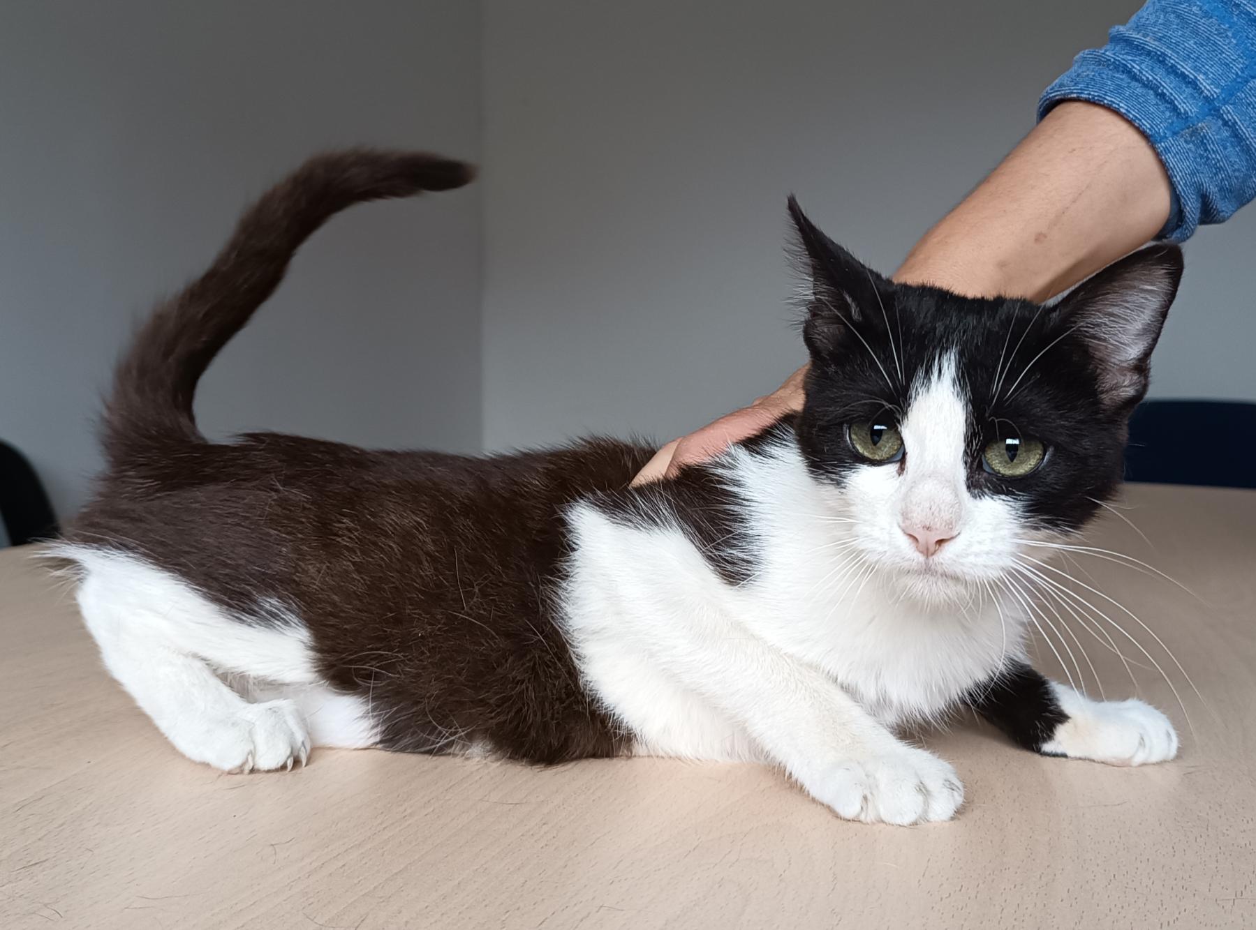 Evarista is een kat met ataxie, ze heeft een beetje coördinatieverlies bij het lopen, maar ze kan rennen en springen. Ze is heel lief, super afhankelijk van mensen, sociaal en aanhankelijk.