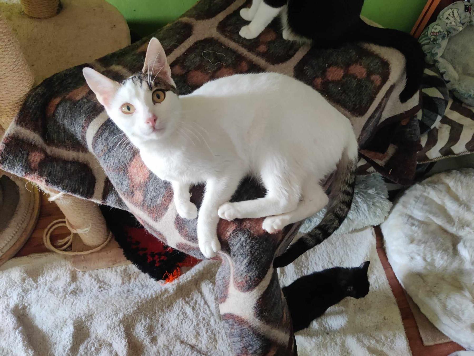 Ze is gered, samen met haar moeder en zusje. De kittens waren heel ziek en eentje lag op sterven, de hele familie werd meegenomen naar de kliniek. 20 dagen lang werden ze geobserveerd in de kliniek. Ze hebben het allemaal overleefd. Toen ze gezond genoeg waren mochten ze naar een gastgezin, daar was ook een hond. Ze groeiden op in het gastgezin en kwamen daarna in de opvang bij de andere katten. Ze komen uit een iets ander stadje dan waar de opvang van onze vriendin zit, maar altijd als ze Varna bezoekt krijgt ze wat mee naar huis vanuit de kliniek.
