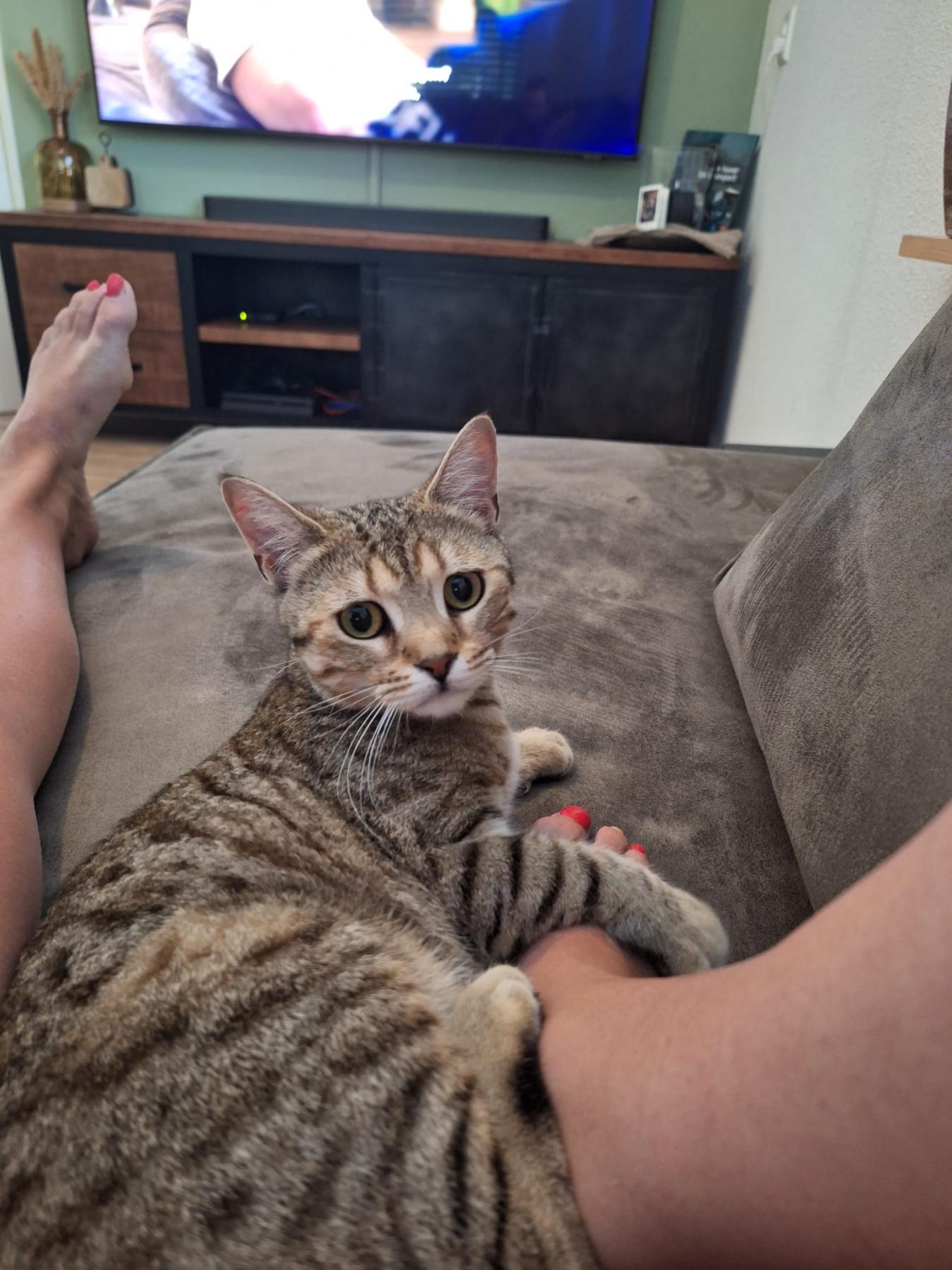 Een lieve poes dat graag speelt en erg afhankelijk is. Ze laat van haar horen als ze aandacht wilt of honger heeft. Verder komt ze graag bij je knuffelen.
