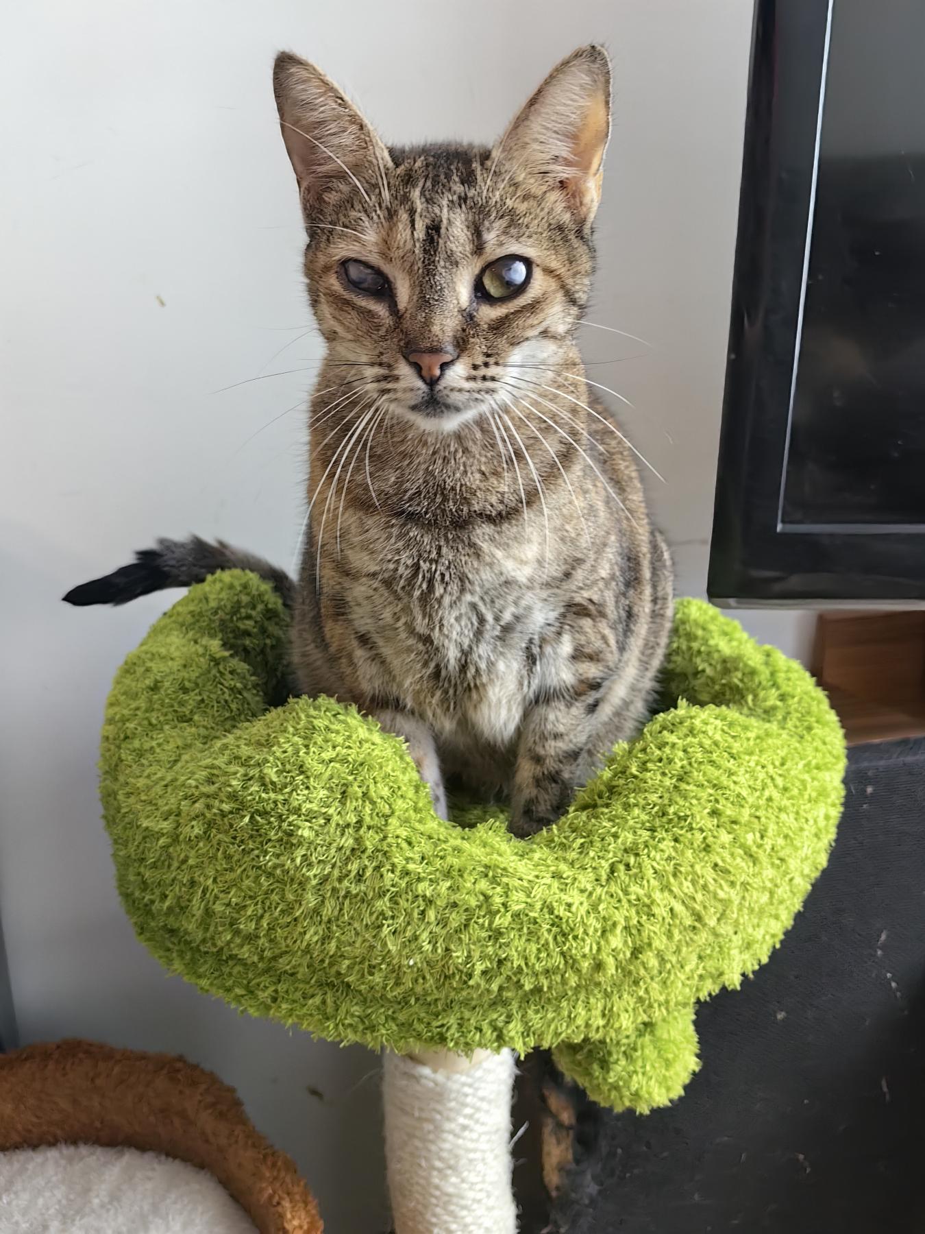 Luna is ongeveer volledig blind. Het kan niet meer verholpen worden met een operatie. Ze zal blind blijven en kan in het begin tegen dingen aanlopen. Ze heeft ook iets dat een beetje op ataxie lijkt. Eerst dachten de dierenartsen dat het door de blindheid kwam, maar dat is het niet. Ze viel uit een krabpaal van ongeveer 80cm hoog Als ze valt valt ze op haar rug of zij. Ze maakt ook geen haast met opstaan. Ze gaat met haar poten in de lucht spelen. Ze is als een blij maar langzaam kind. Ze heeft je daarbij ook nodig om op te letten dat ze zichzelf geen pijn doet.