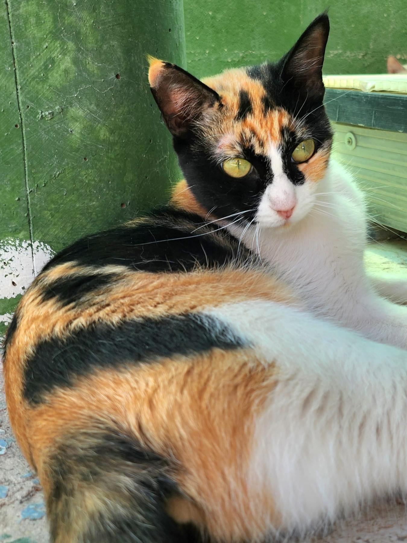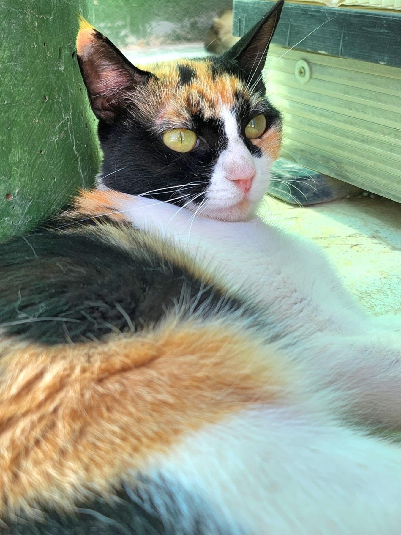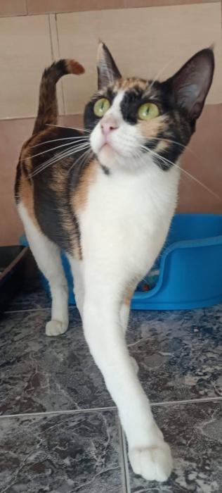 Macy woonde bij haar mens in huis, toen ze haar naar het asiel bracht vertelde ze dat Macy alleen, samen met haar in huis leefde, zonder andere katten om zich heen. Helaas moest haar mens terugkeren naar haar land en kon ze daar niet voor haar zorgen. Ze werd naar het asiel gebracht, daar logeert ze inmiddels in een groep. Daar wordt ze ongelukkig van. Ze was niet gevaccineerd of gecastreerd, dat is inmiddels in orde gemaakt. Ze was in goede gezondheid. Toen ze in de dierenkliniek werd gesteriliseerd, ontdekten ze dat ze zwanger was, wat betekende dat de eigenaar had gelogen. Ze had ofwel met andere katten samengeleefd of buiten contact met ze gehad. Daarmee is haar achtergrondinformatie niet betrouwbaar. Ze zal een nieuwe start moeten maken. Ze is een aanhankelijke, lieve poes, zonder afhankelijk te zijn. Ze is rustig en lief van karakter.