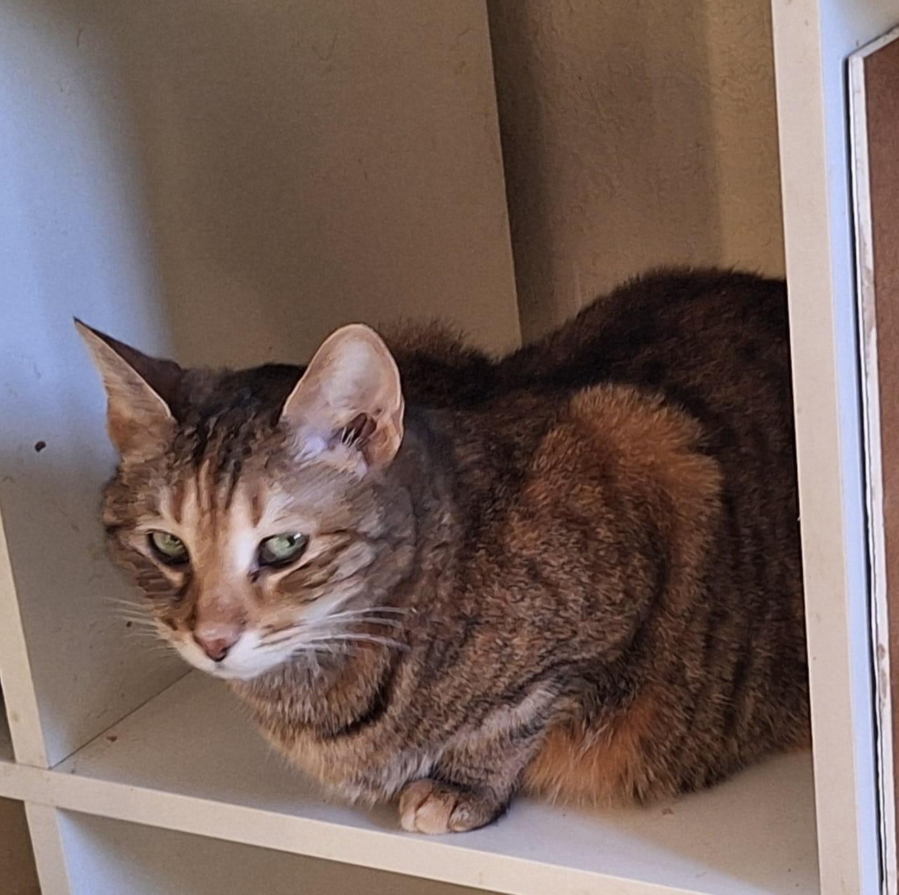 Nola slaapt graag lekker in haar krabpaal, liefst een beetje hoog. Een keer was er teveel onrust in huis, daar schrok ze zo van dat ze zich verstapte en ze een tijdje last had van haar pootje, maar dat is inmiddels weer helemaal over. Ze laat zich zo nu en dan even aaien maar het moet allemaal een beetje rustig zijn. Het is een zachtaardig en lief diertje.