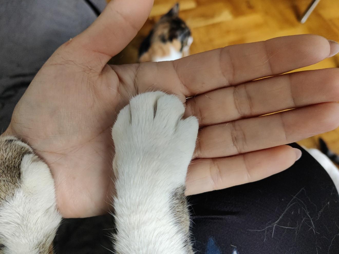 Pele is groot! Net als een groot konijn. Hij is niet zwaar. Zijn poten en lijf zijn groot in vergelijking tot de andere katten. Hij lijkt een ander soort te zijn.
