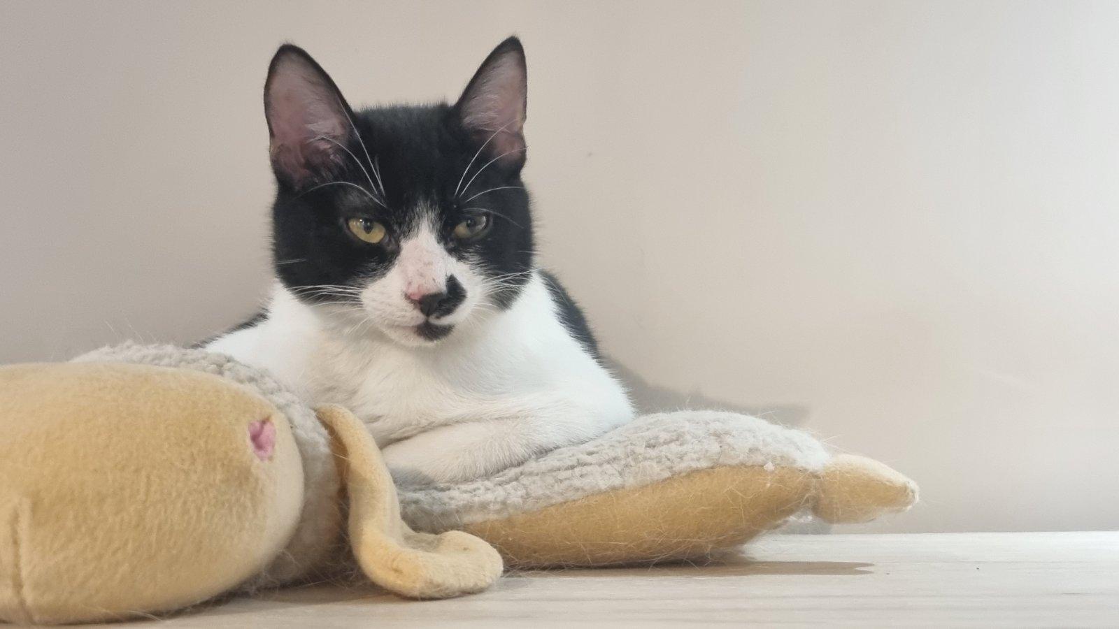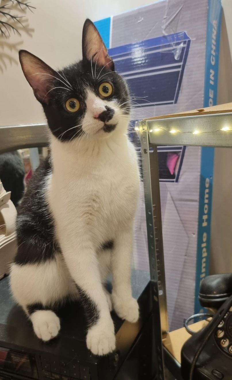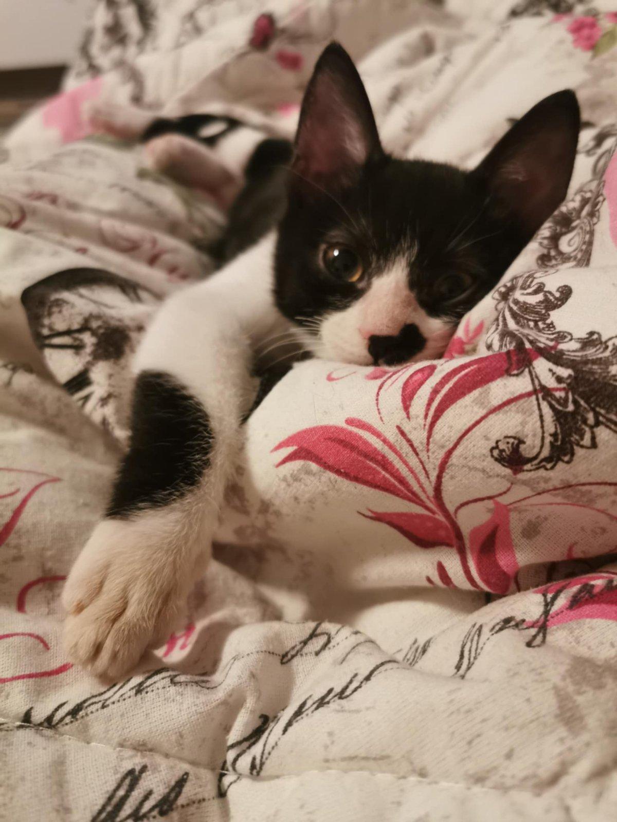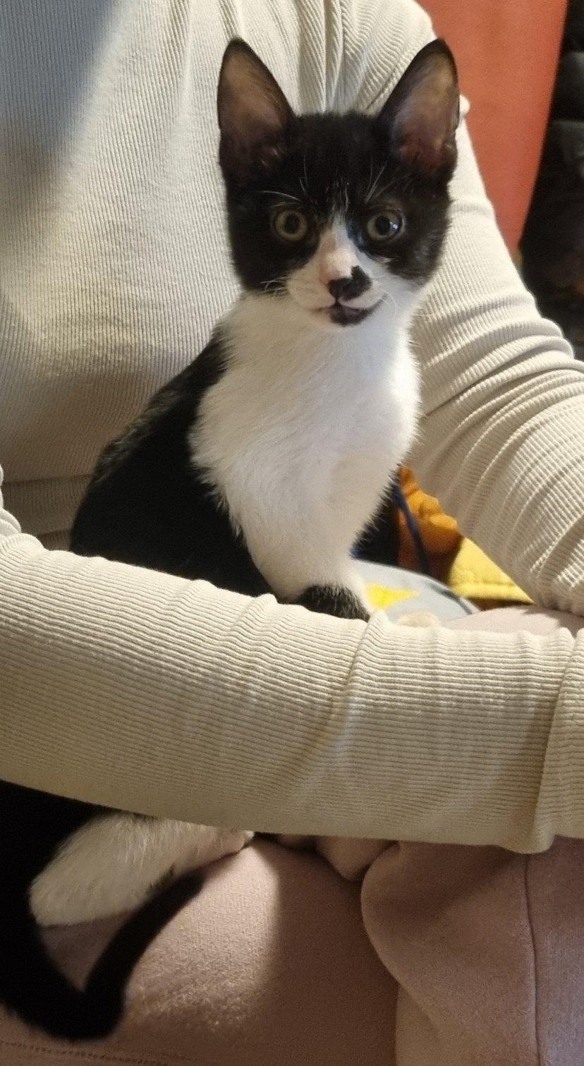 Spot is grappig en nieuwsgierig. Hij houdt ervan om alles te ontdekken en ermee te spelen. Hij vindt het geweldig om kapsels te kneden met je haar als luchtkoekjes. Hij is erg speels. Hij klimt en verstopt zich op hoge plekken. Hij is een mix tussen een aap en een kat. Het is een echte lieverd. Drink koffie in een mok, want hij wil je koffie kopjes geven (alleen koffie, andere dranken laat hij staan). Hij eet veel en eet allerlei soorten voedsel. Hij gaat eten uit de bakjes van de andere katten als zijn eten op is. Het is een echte smulpaap. Hij wil de mens zelfs naar het toilet volgen als hij de kans krijgt. Hij wil overal bij zijn, alles zien en ermee spelen. Hij is knuffelig en slaapt graag bij zijn mens. Soms gebruikt hij je vingers als fopspeen om zichzelf te kalmeren en in slaap te vallen. Hij werd als pasgeborene op de grond gevonden. Hij moest met de fles en kittenmelk gevoed worden. Daarom heb ik hem in een pleeggezin geplaatst waar hij is opgegroeid en nu op adoptie wacht.