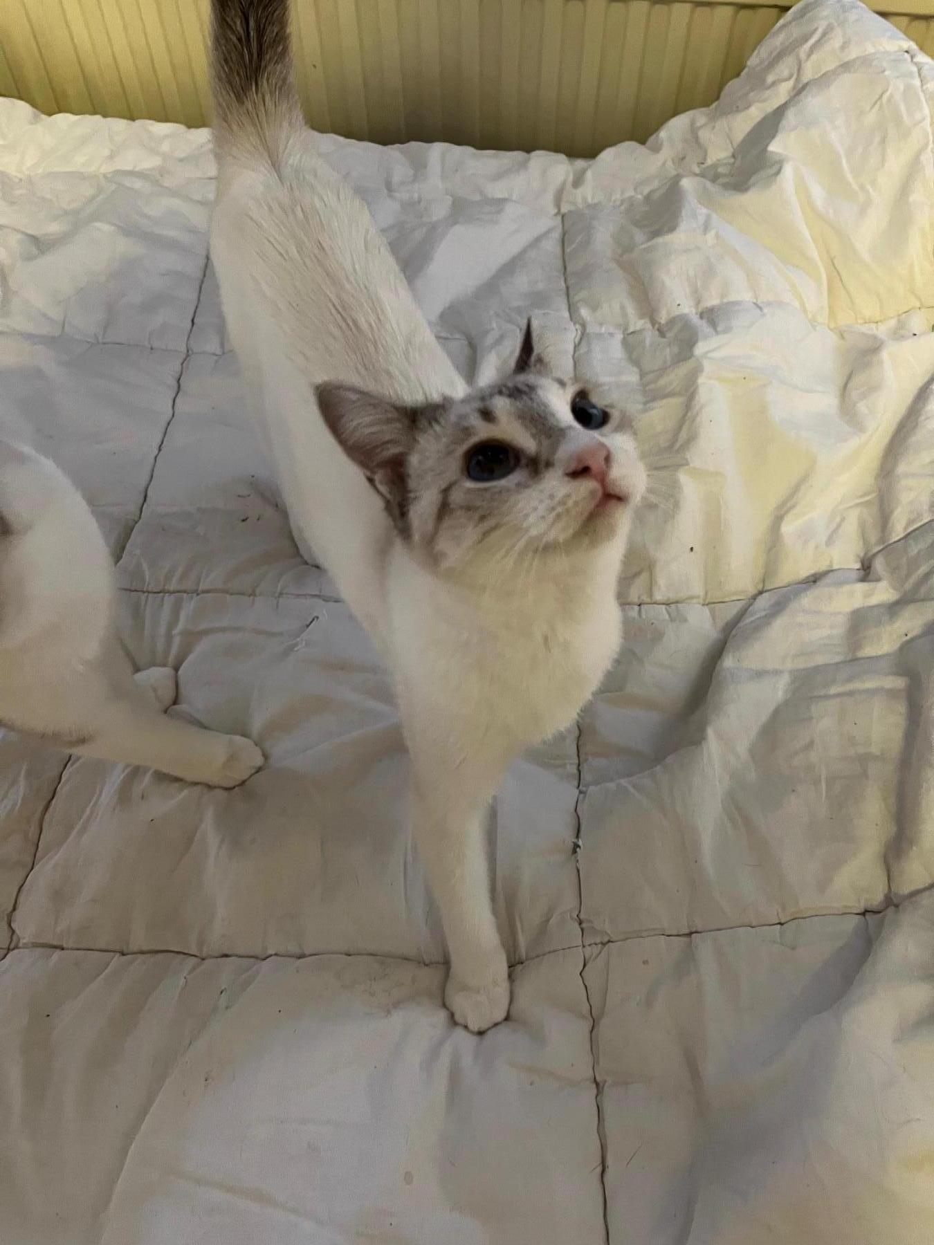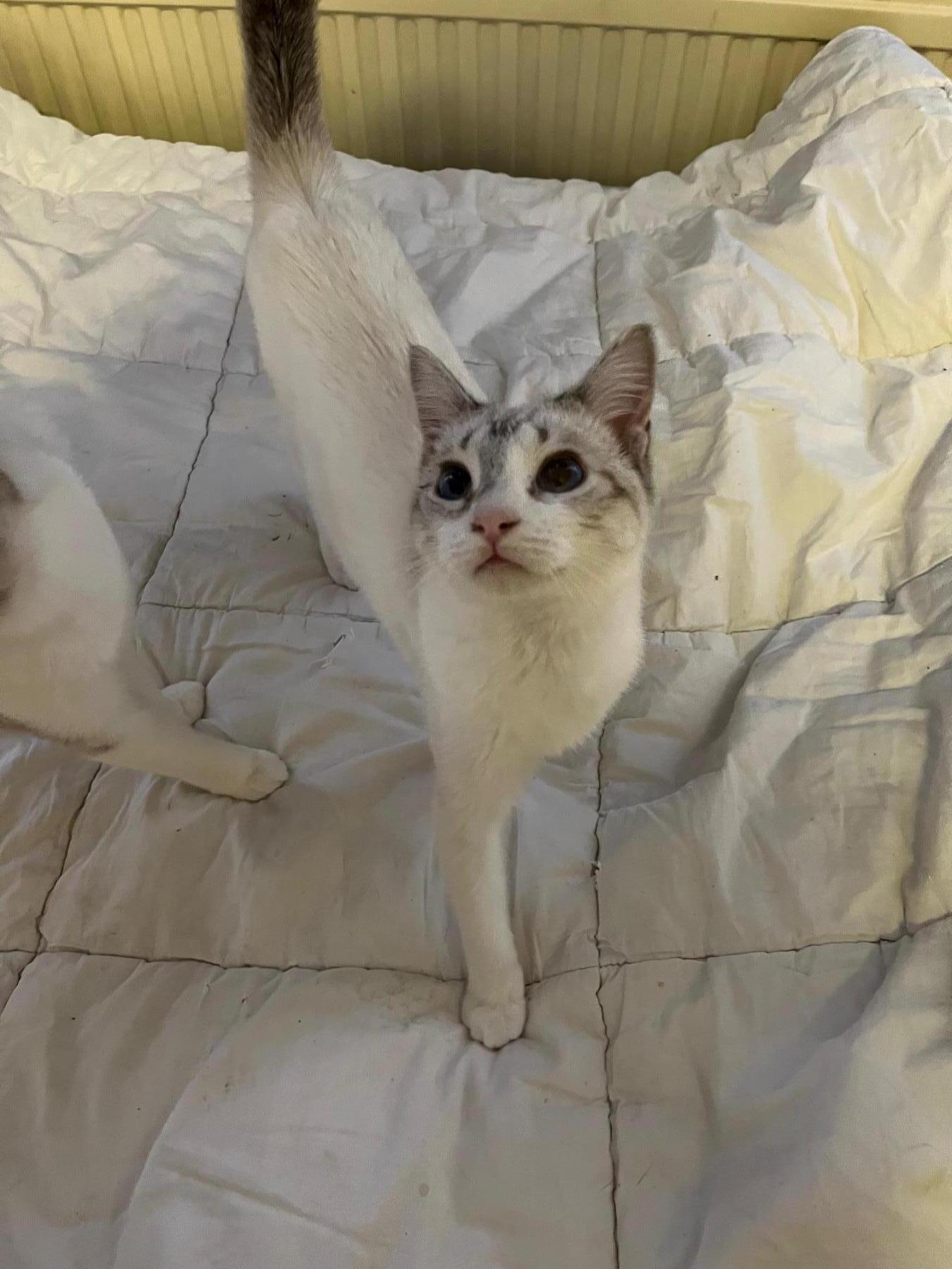 Wij hebben Stinkie tijdens een bezoek aan de asielen in Spanje ziek gevonden in een zwaar vervuilde omgeving. Wij hebben hem, samen met nog een aantal katten weggehaald uit die omgeving en we hebben ze meegenomen naar de dierenarts. Wij hebben hem, samen met nog een aantal katten weggehaald uit die omgeving en we hebben ze meegenomen naar de dierenarts. Stinkie testte positief op FelV. 16 februari zullen we hem na 3 maanden behandelig hertesten. Wij hebben hem de eerste periode in Spanje verzorgd, zolang wij daar waren. Stinkie had last van verkoudheid, we hebben haar daarvoor behandeld. Maria heeft een andere geboortedatum, maar zij blijkt het zusje van Stinkie te zijn. Ze zijn graag samen. Ze waren zo ziek toen ze weggehaald werden dat het even duurde dat we ze als broer en zus herkenden.