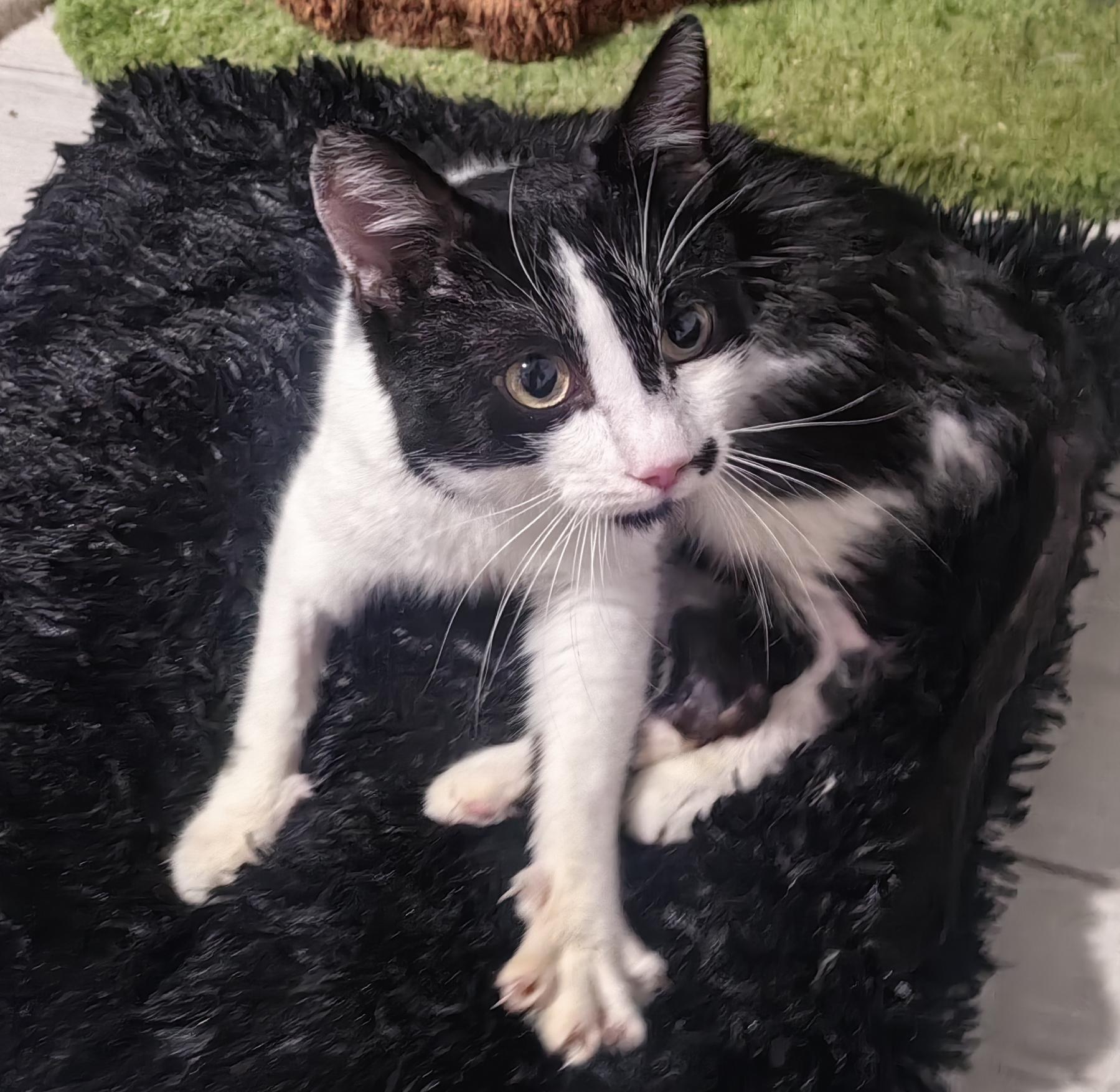 Tuxi is onder de verf gevonden, op het moment dat de fotos gemaakt zijn miste hij nog steeds haar. Hij was behoorlijk ziek, gelukkig is hij inmiddels een gezonde jongen. Hij is een ontzettend knuffelig katje! Hij is lief, aardig, sociaal en heel aanpasbaar. Hij begint zelfs te spinnen als hij de rescuer een andere kat ziet aaien. Hij is heel erg schattig. Het hele team van de kliniek was verdrietig toen de rescuer hem mee naar huis moest nemen na zijn verblijf voor behandeling en operatie . Hij is lief en zo schattig! Hij houdt van menselijke aandacht. Hij vindt het heerlijk om met andere katten te spelen en te knuffelen. Hij is een echt sociaal dier.