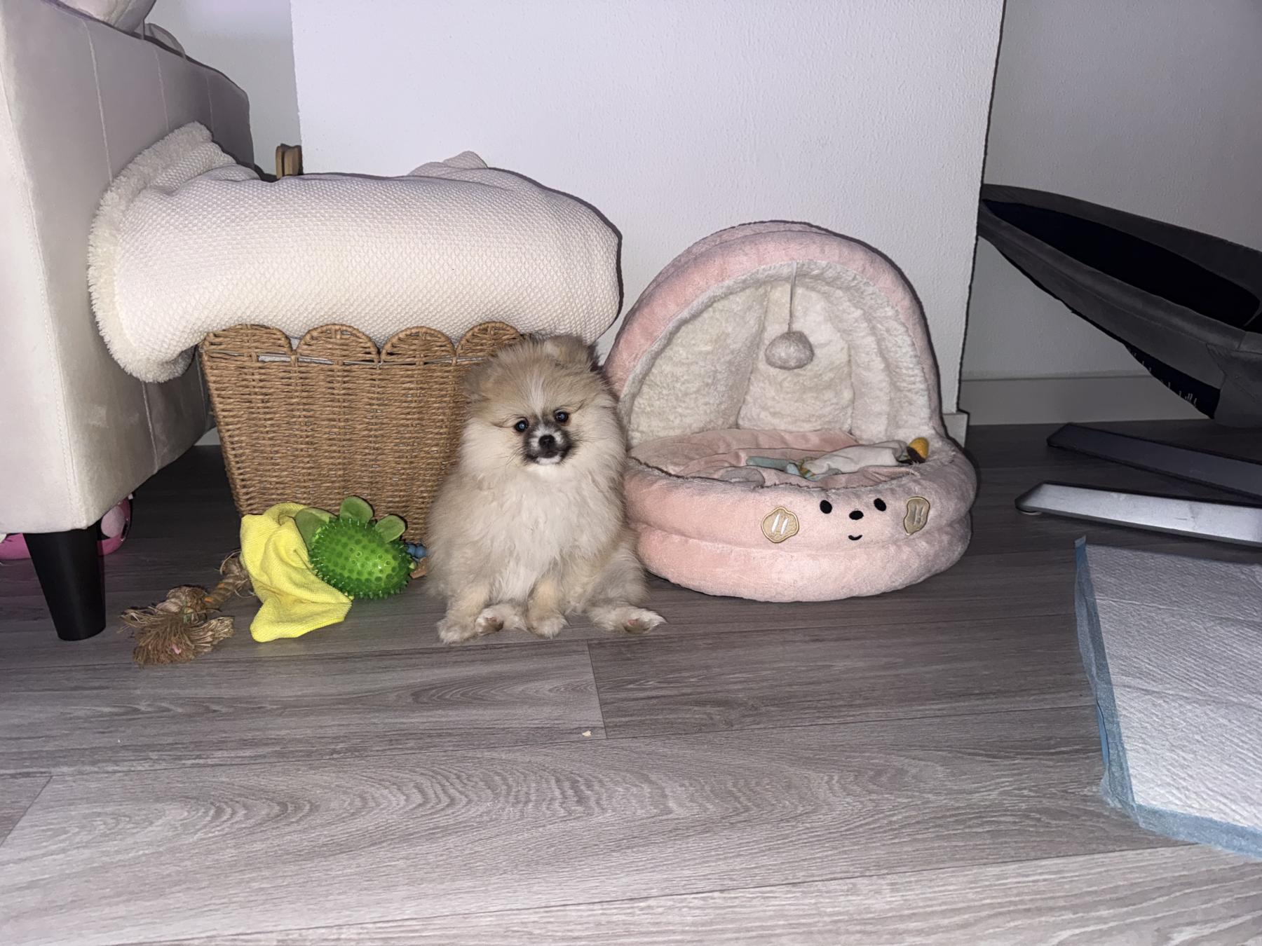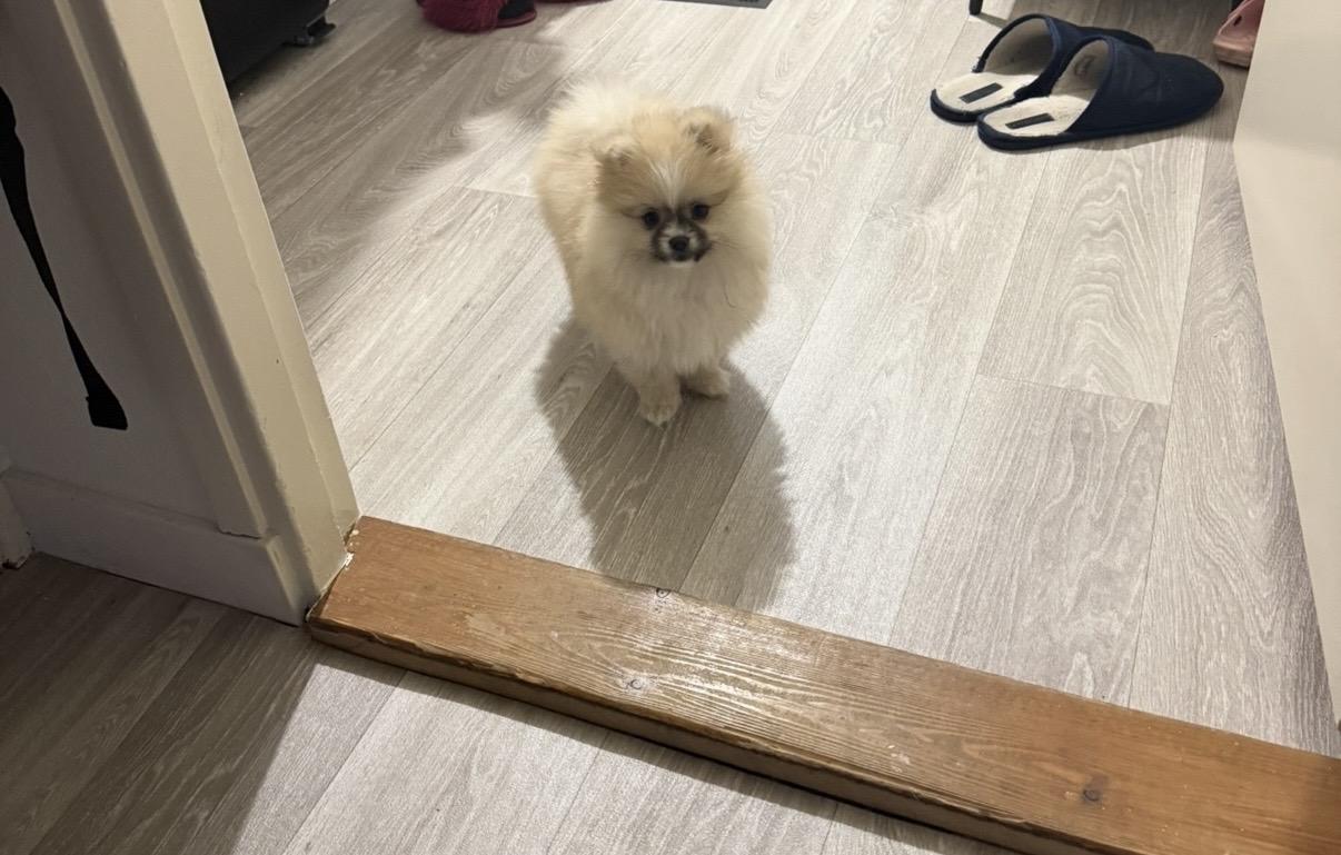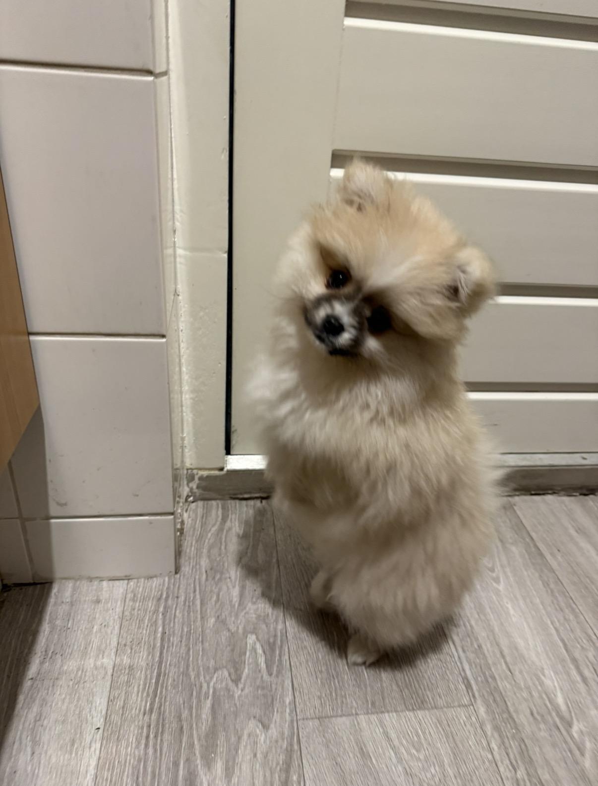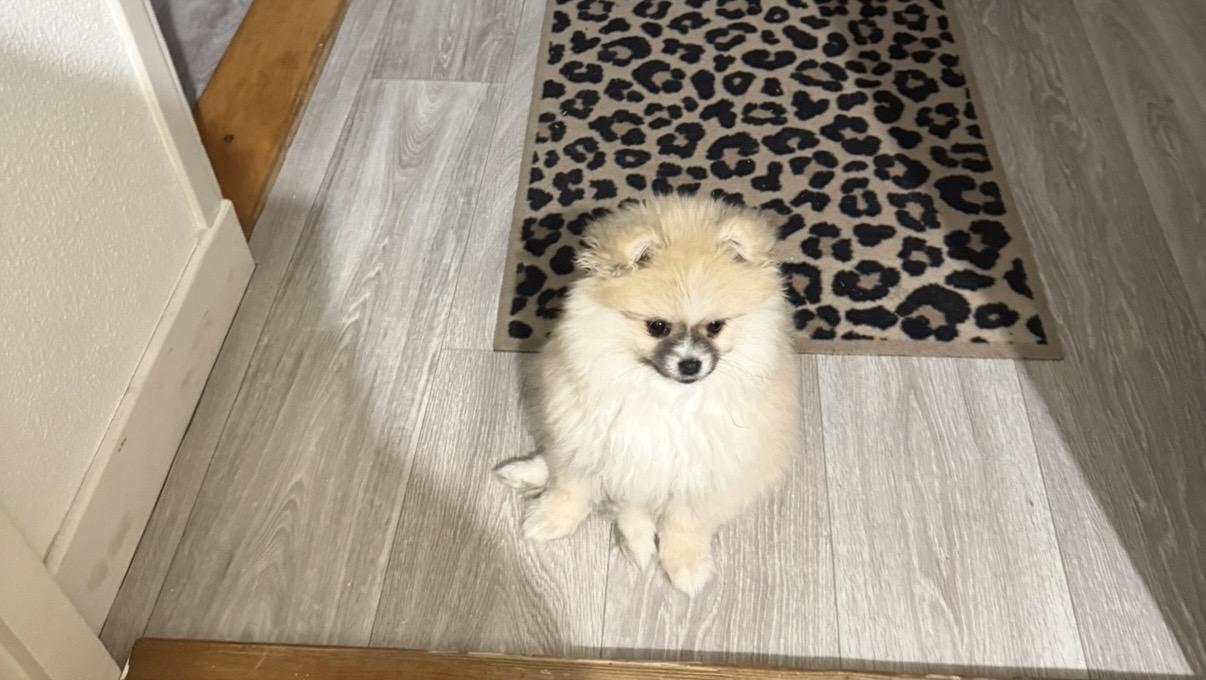 De kleur is blond ze is klein met een fluffy vacht.