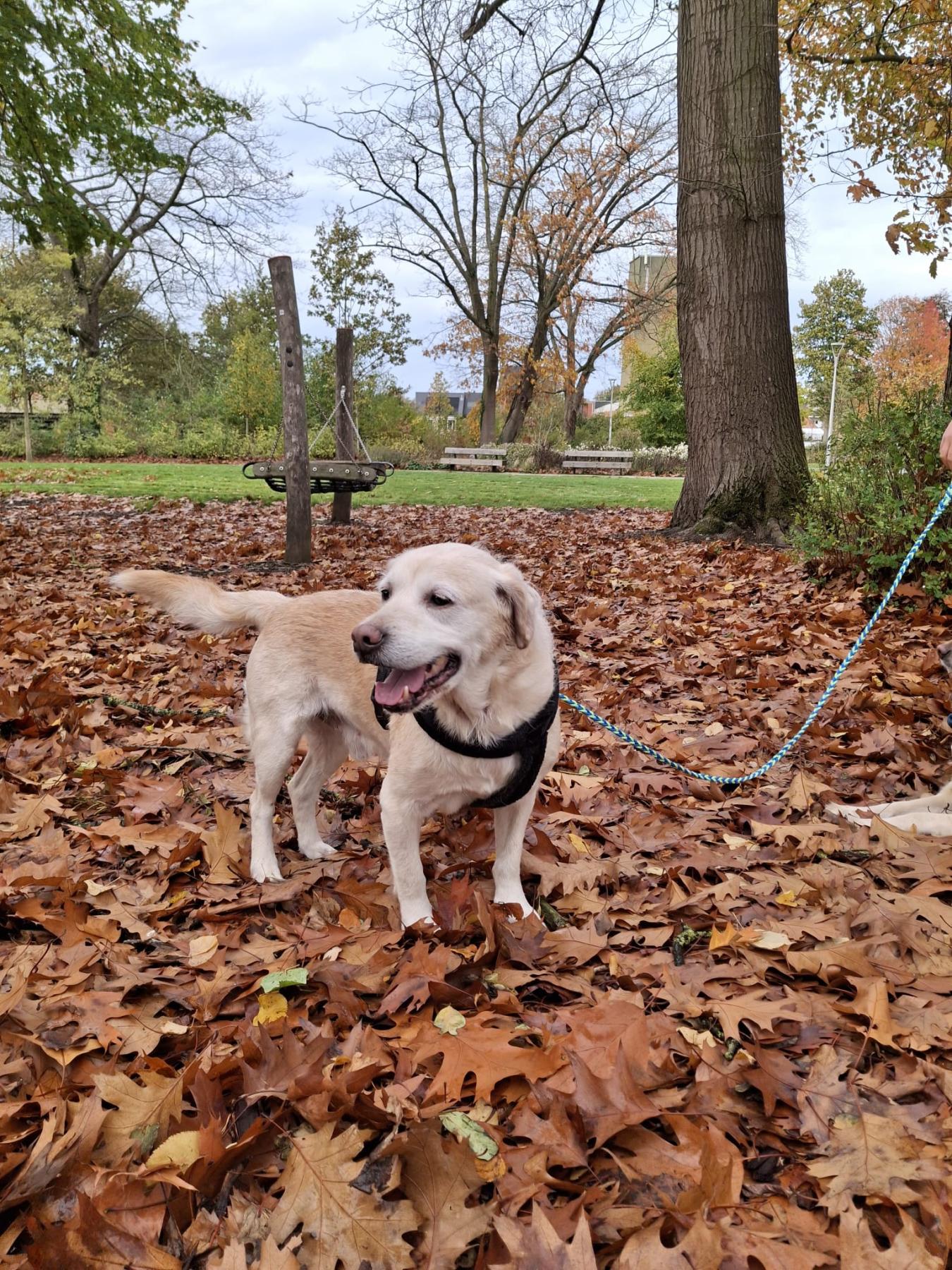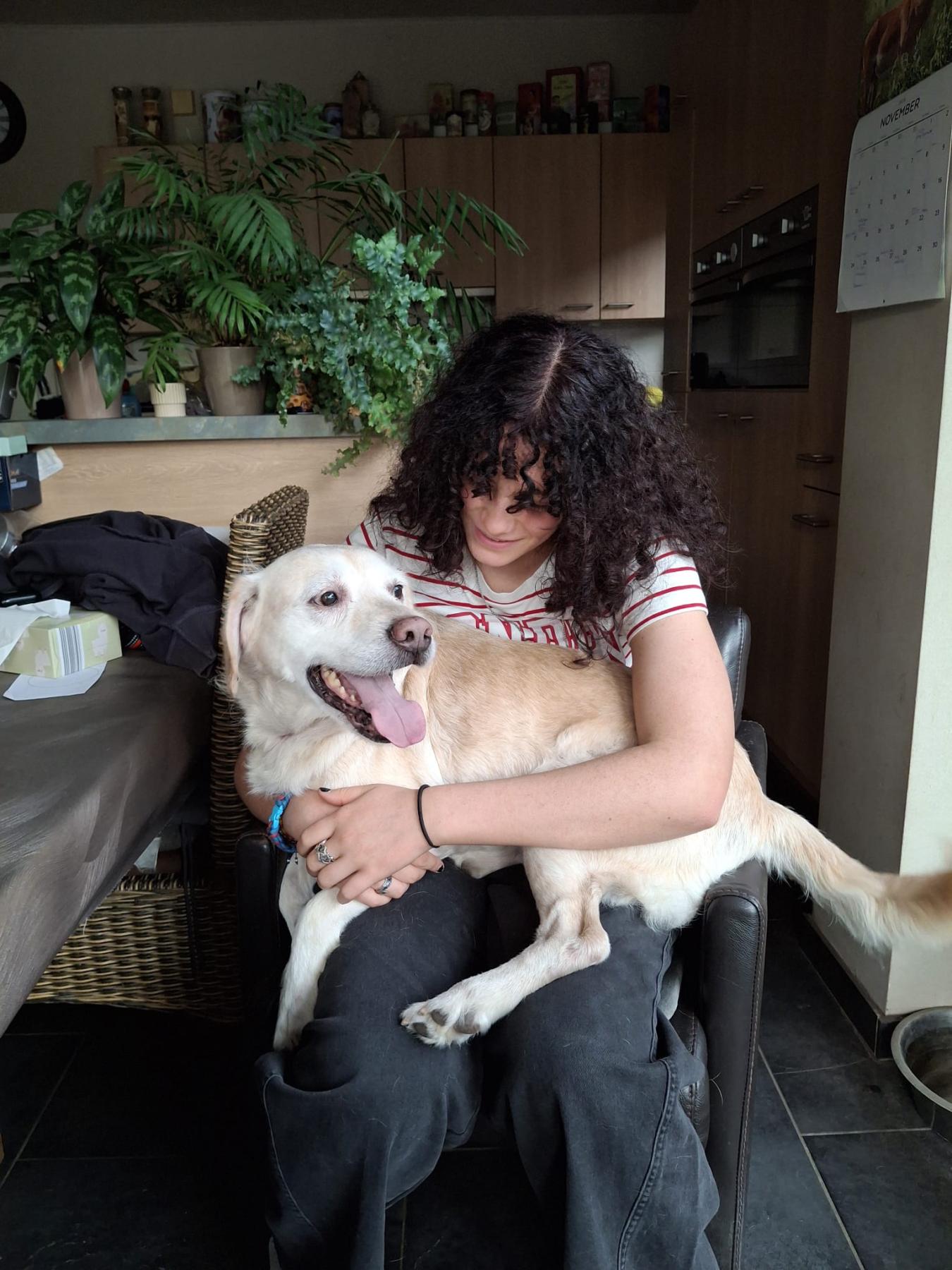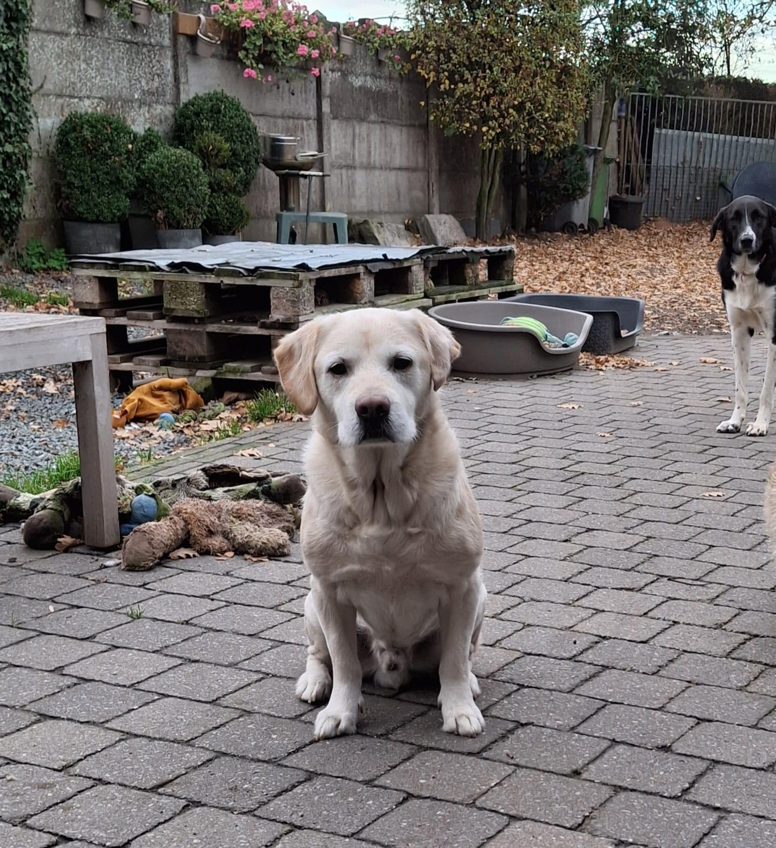Hij is een super lieve labrador mix, houdt van knuffelen en is aanhangkelijk. Gaat graag op wandel, dat doet hij nog erg goed en is nog erg sterk. In huis is rustig, zindelijk, maakt niks kapot. Kan perfect met andere honden behalve pups. Ook als enige hond geen probleem als hij zijn knuffels maar krijgt.