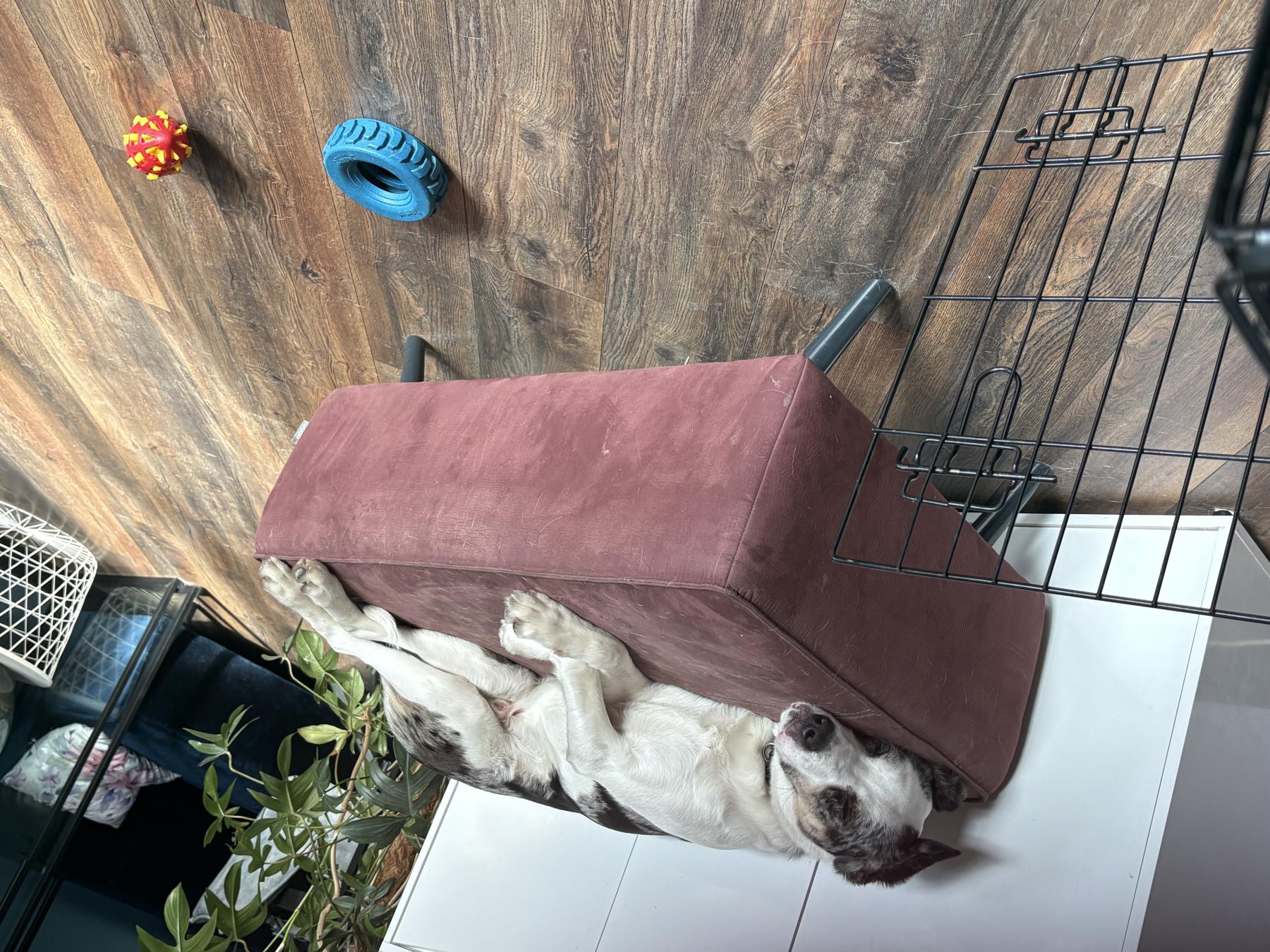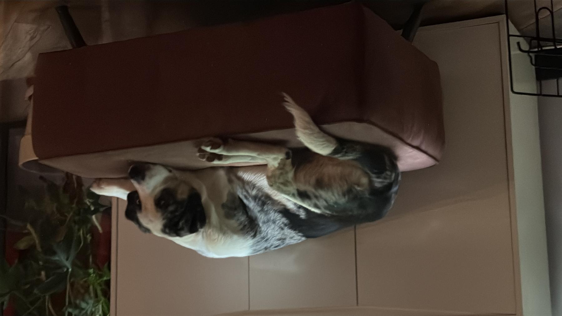 Hij slaapt ‘s nachts en als wij weg zijn nog in zijn bench.