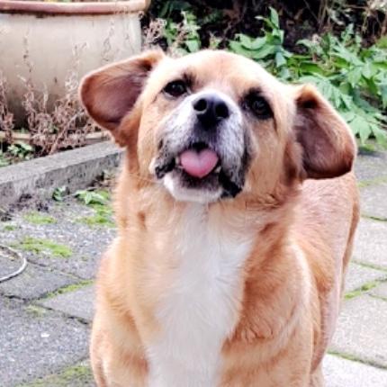 Middelgrote hond (±13 kg) met een lang lijf en korte pootjes (corgi-achtig). Bruin/oranje vacht, wit befje en pootjes, en een lief grijzend snoetje.