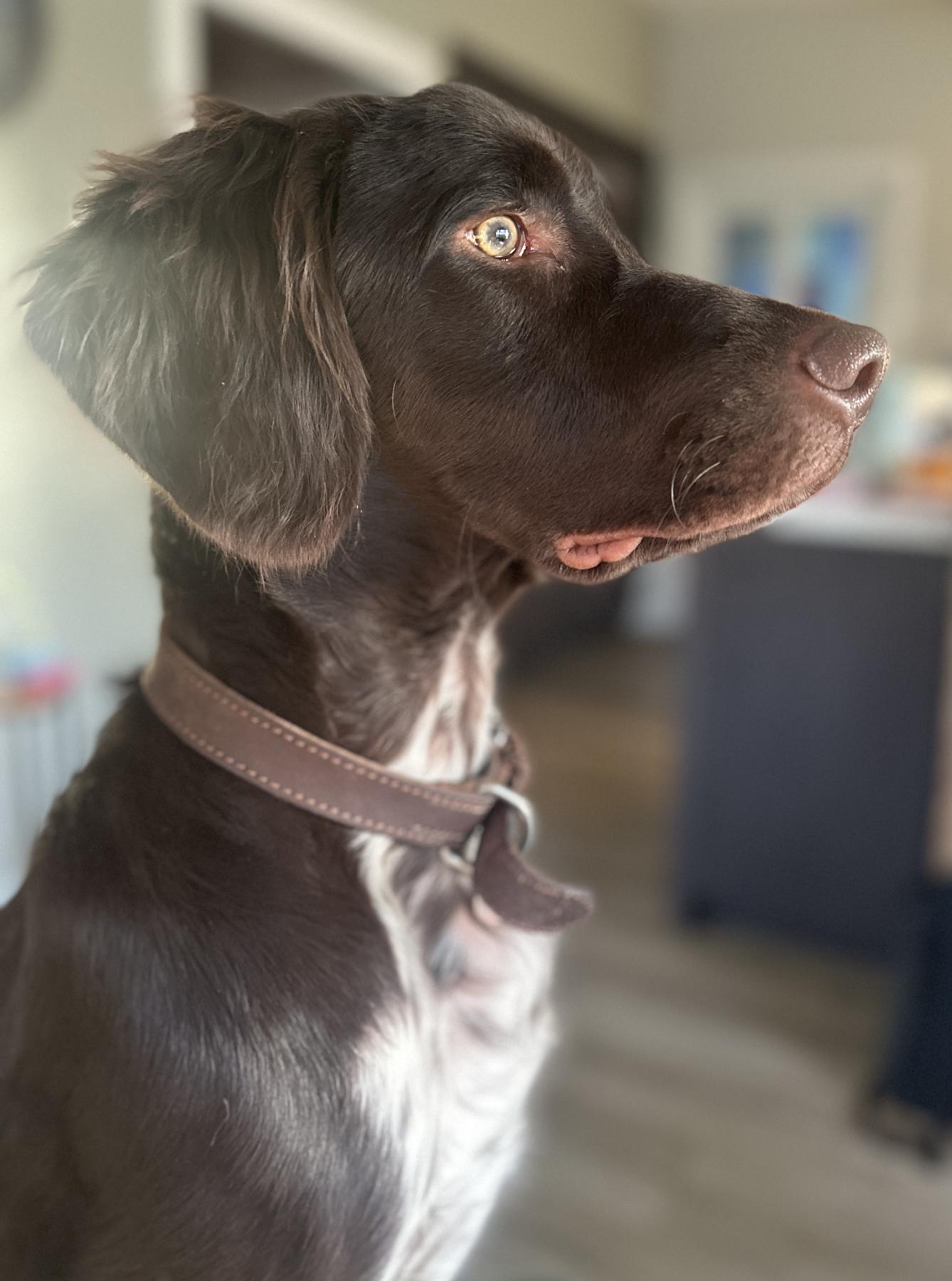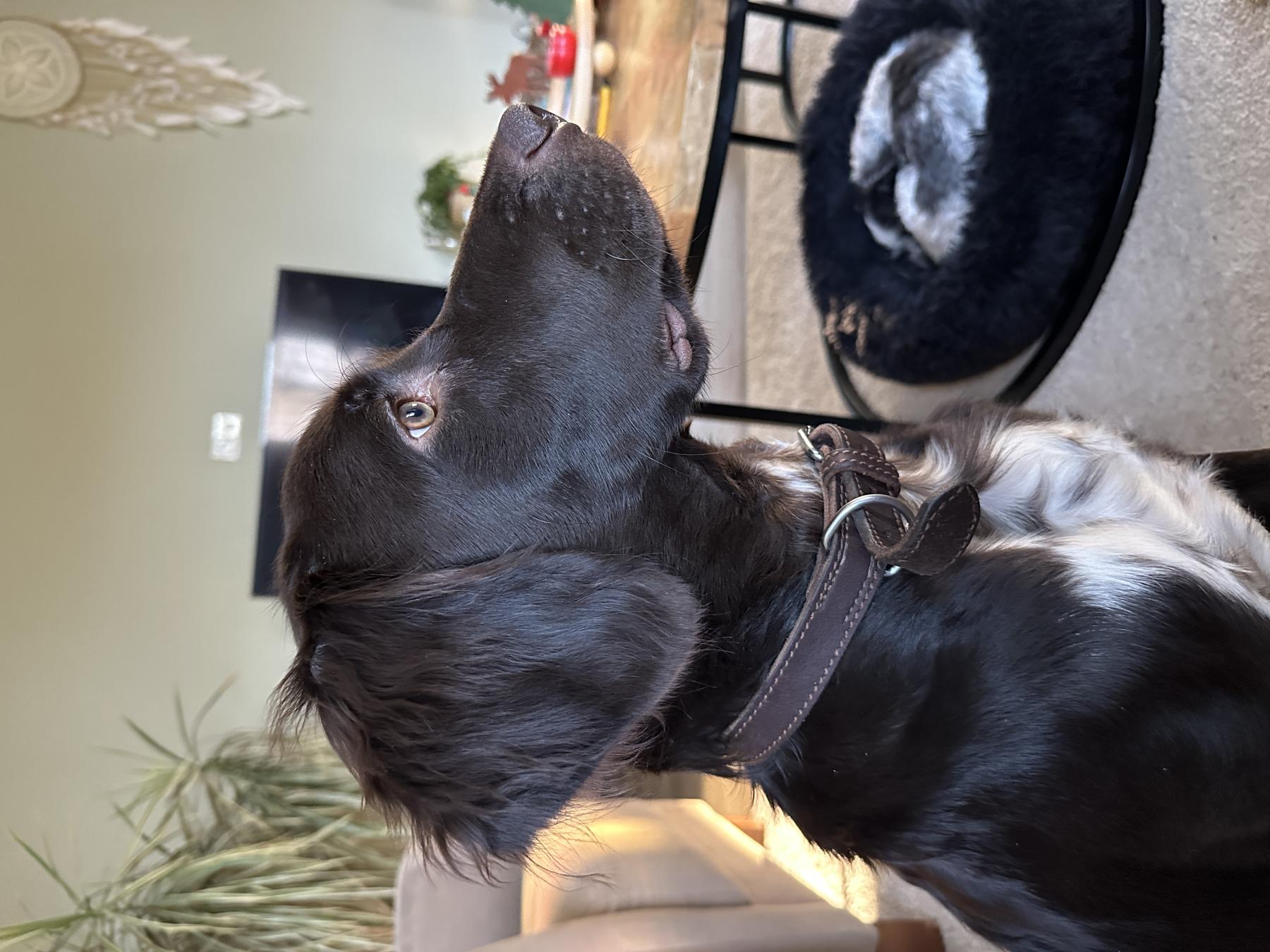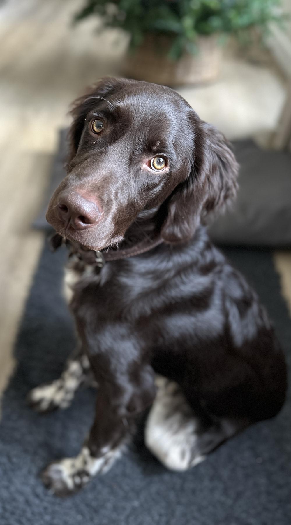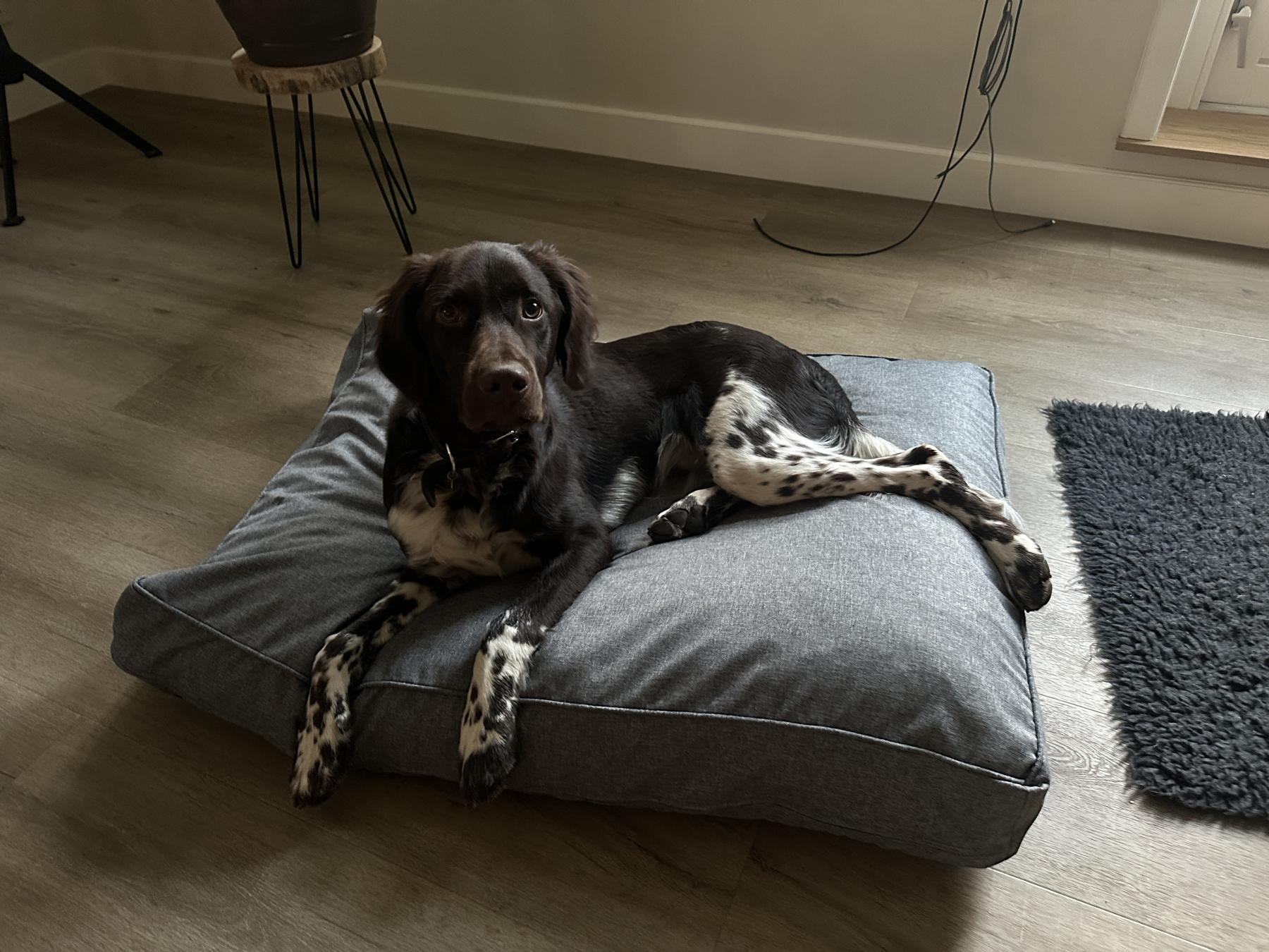 In huis een lieve sociale hond. Nog wel jong en speels. Wil graag geknuffeld worden, aandacht geniet hij van. Luistert in huis goed.