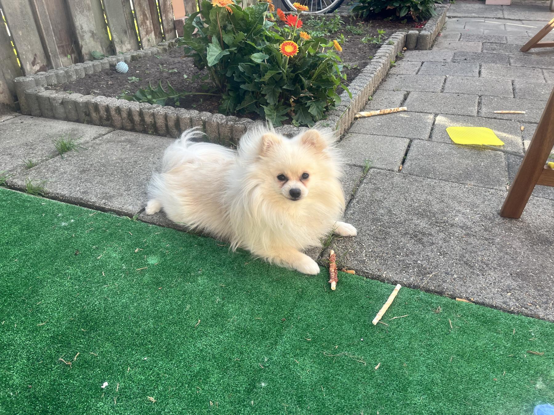 Hij doet zijn behoeftes tijdens het uitlaten binnen,maar in de avond op een puppy matje en dat gaat soms weleens fout