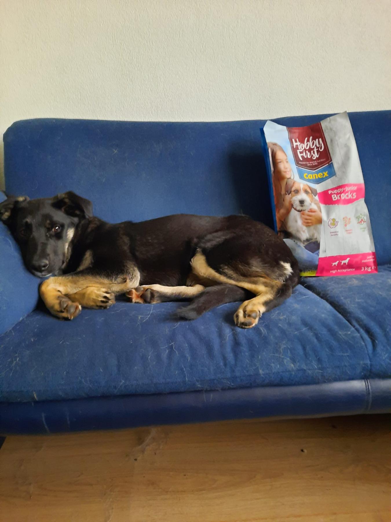 Ze doet het hier prima in de groep met 3 reuen en 1 andere teef, is zindelijk en kan al netjes aan de lijn lopen.