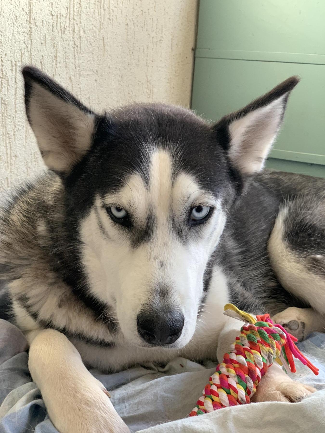 Dama is een prachtige huskydame die met 58cm behoorlijk aan de maat is. Ze is 2 jaar oud (april 23) en heeft een typische husky uitstraling met haar ijsblauwe ogen. Ook haar karakter is typisch husky, met prettige kanten zoals vriendelijk, sociaal en speels, maar zeker ook de uitdagende kanten zoals slopen, graven, eigenwijs, slecht alleen kunnen zijn en trekken aan de lijn. Ze kan in de roedel wat dominant overkomen en we zien haar het liefst bij een reu geplaatst of als hond alleen. Ze mag graag spelen met andere honden maar is voor kleiner formaat honden wat te. Kan zich ook prima met speeltjes vermaken. Ze wil niet opgesloten zitten in een bench maar los in huis is het nog opletten want ze moet nog alles leren als huishond. Ze loopt wel makkelijk mee aan de lijn. Aanhankelijk en open.