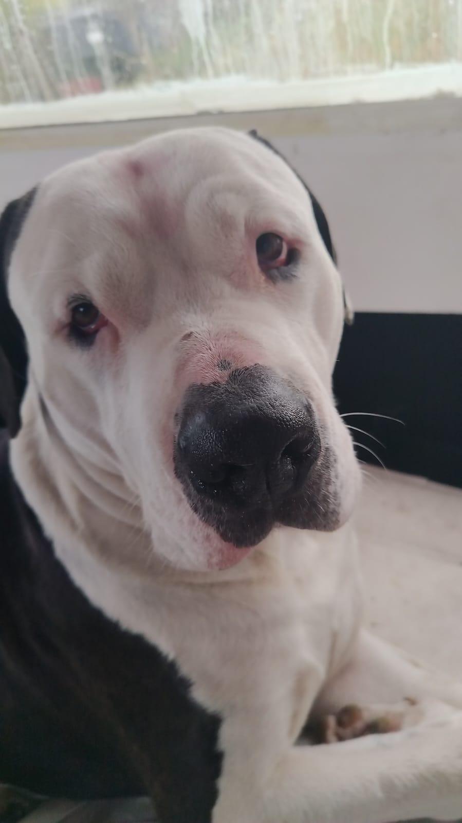 Grote, jonge American Bully XL van 2 jaar. Een echte lieve lobbes: wat lomp, speels en aanhankelijk. Kan goed met andere honden en speelt graag. Vol energie en nog volledig trainbaar. Van nature waaks en alert, wat in de juiste omgeving en met consequente begeleiding goed te sturen is. Zoekt een rustige plek bij iemand met ervaring met sterke, jonge honden