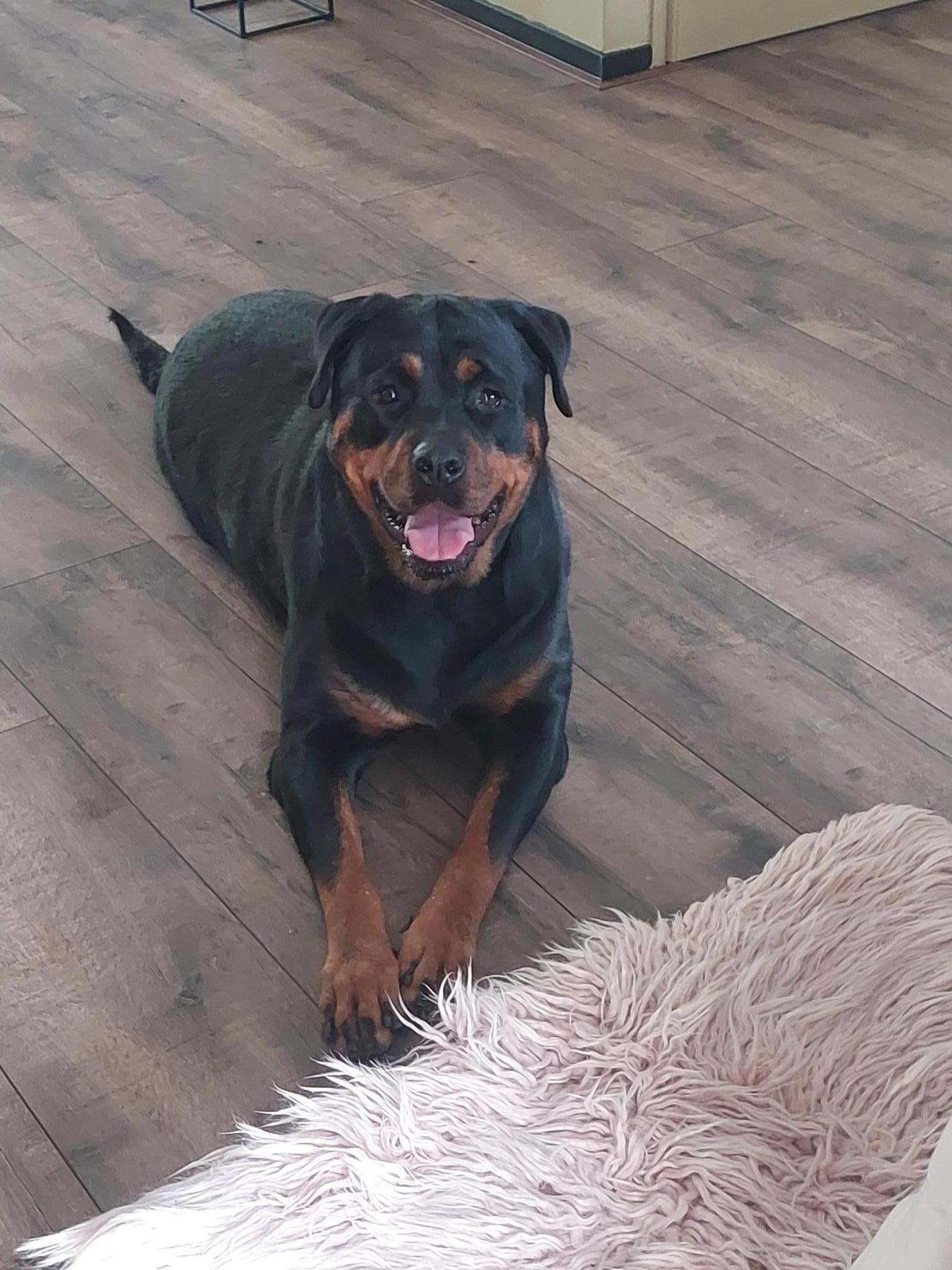 Geen allemansvriend maar voor ons is ze erg lief. Als er iemand komt die niet bang voor haar is is het prima maar zodra je onzeker overkomt is ze niet echt aardig. Ze kan niet bij kinderen. Ze is groot en sterk. Rond de 50 kilo