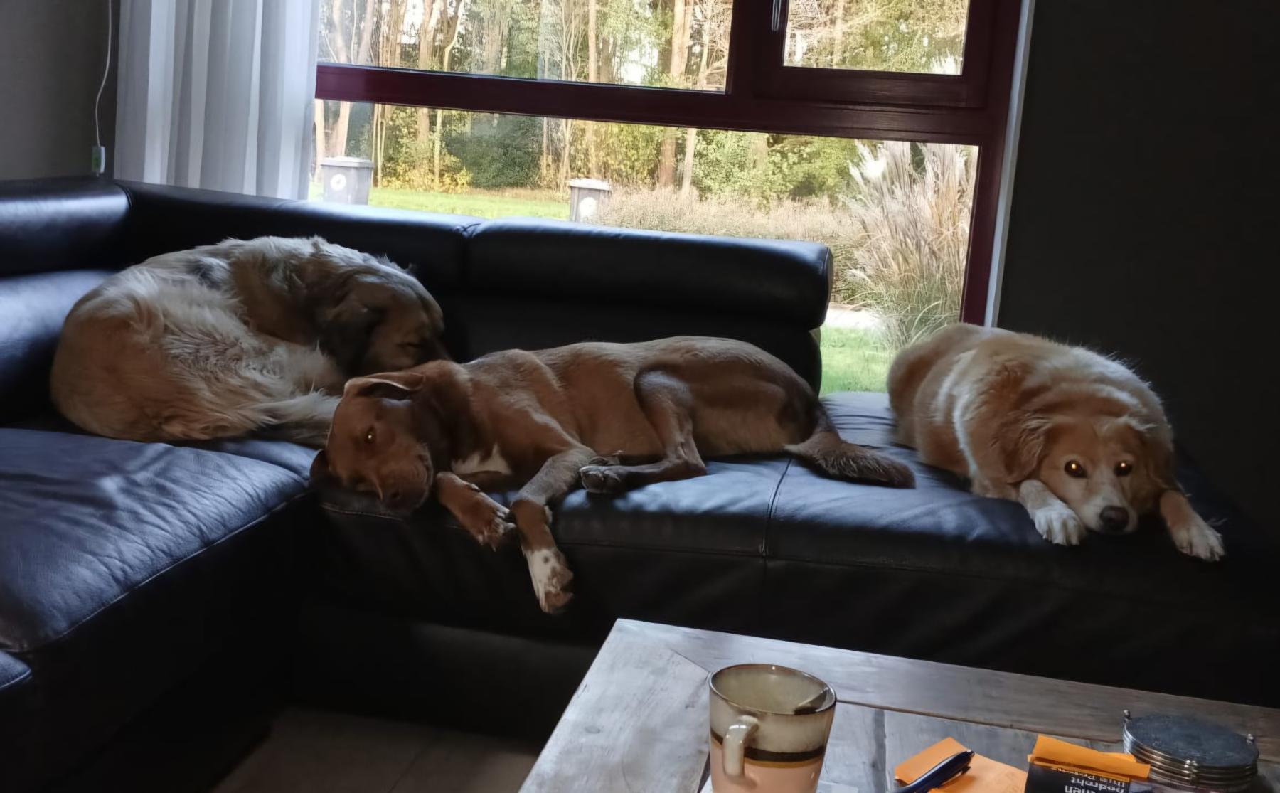 Zij kan al een paar uurtjes alleen zijn, maar heeft dan wel gezelschap van haar hondenvriendjes.