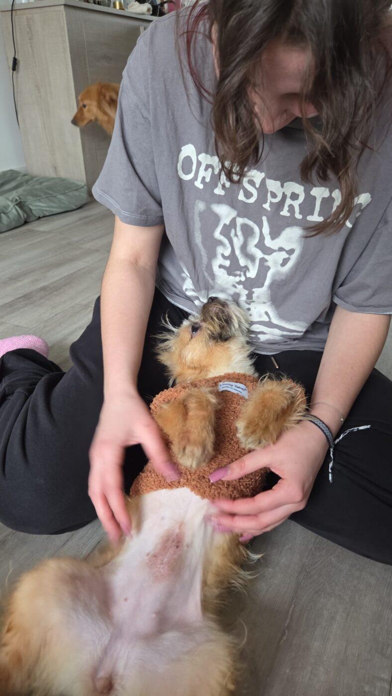 Een borstelbeurt…het maakt niet uit, kleine Eva vindt het allemaal geweldig en haar staartje draait overuren. Over haar kapsel gesproken… daar is nog wel wat werk aan want in Roemenië hebben ze haar “geknipt” en dat is niet helemaal volgens de laatste mode gedaan, maar gelukkig groeit haar vacht vanzelf en kan er te zijner tijd een mooi model gemaakt worden zodat ze er dan weer volgens de laatste mode bijloopt (of hoe haar nieuwe baasje ook wil dat ze erbij loopt).