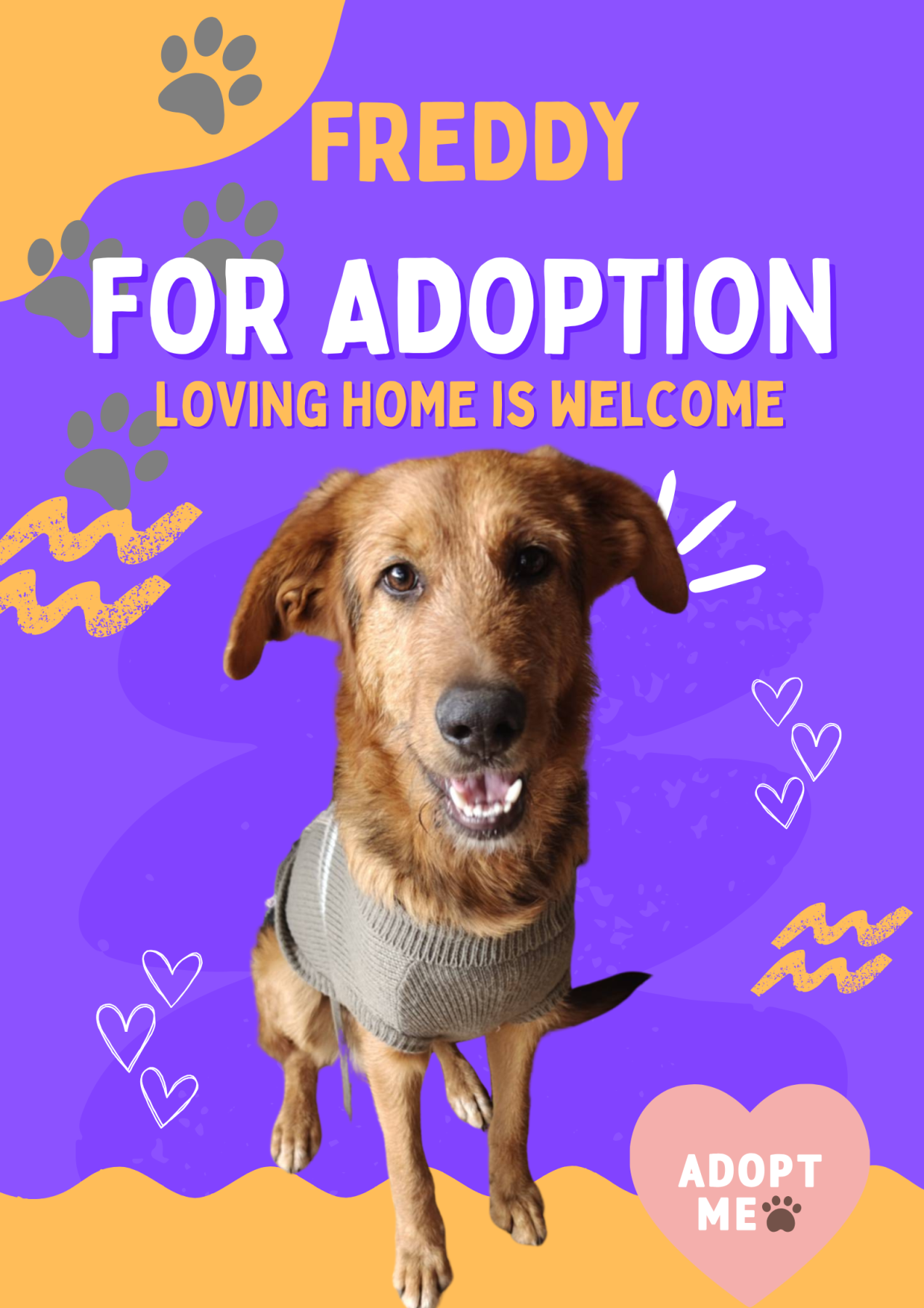 Freddy is een grote, lieve jongen met een enorm zacht karakter. Hij zoekt een warme familie die hem verder wil begeleiden en hem eindelijk het veilige thuis wil geven dat hij verdient.